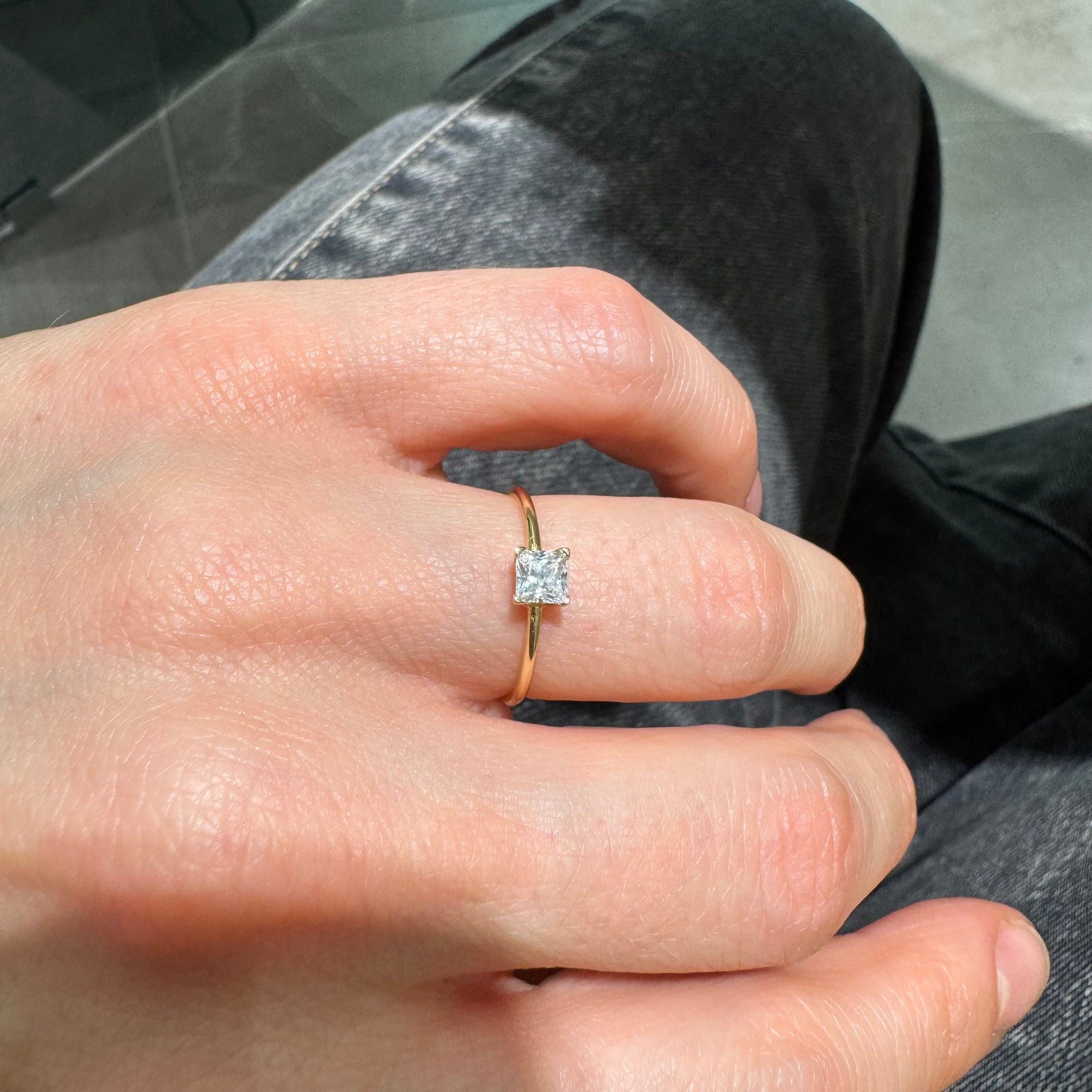 Anello in oro giallo 18KT/ 750% con zircone quadrato (taglio princess) incastonato nella parte centrale .