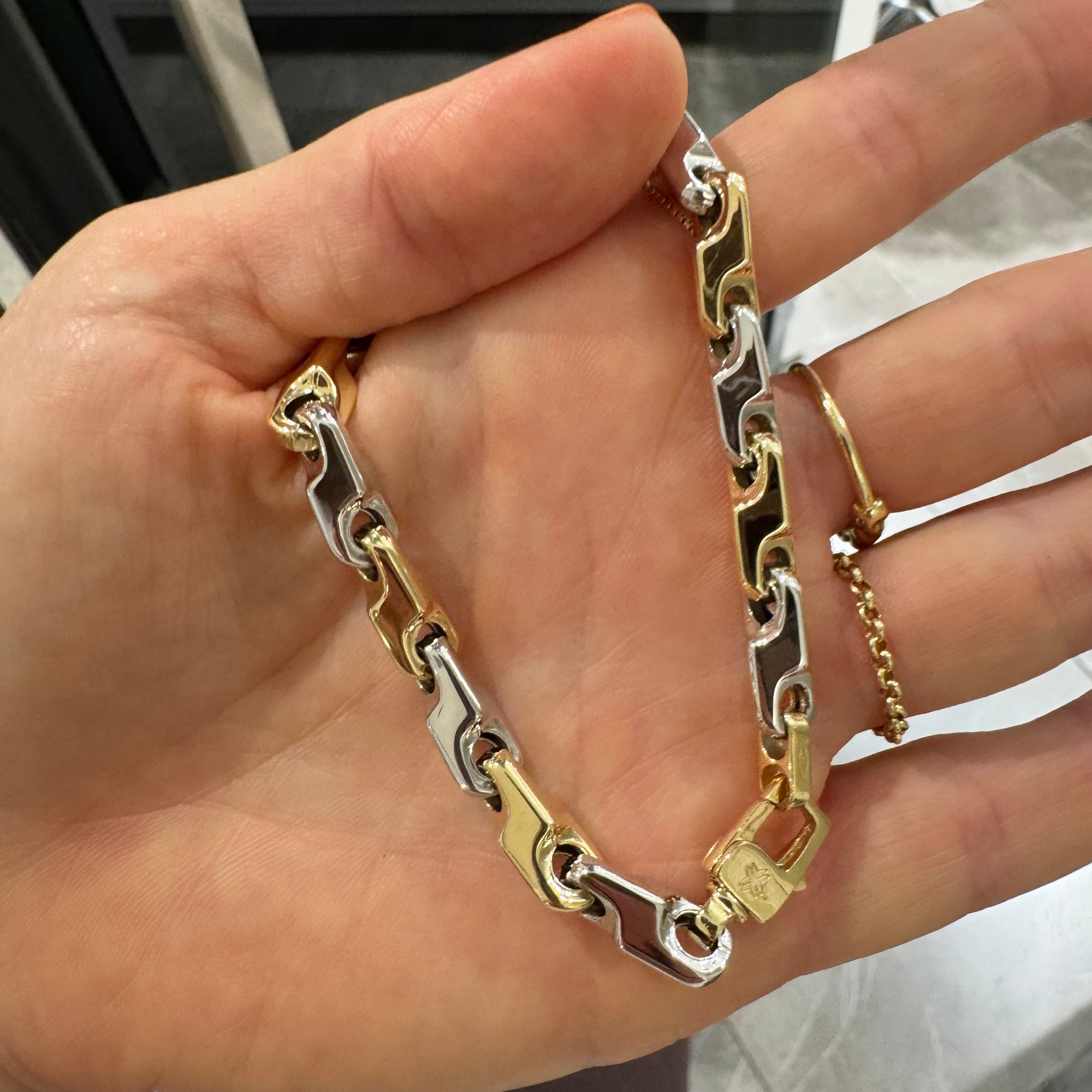 Collana in oro giallo e bianco 18KT/ 750%, a maglia intrecciata e chiusura a moschettone.