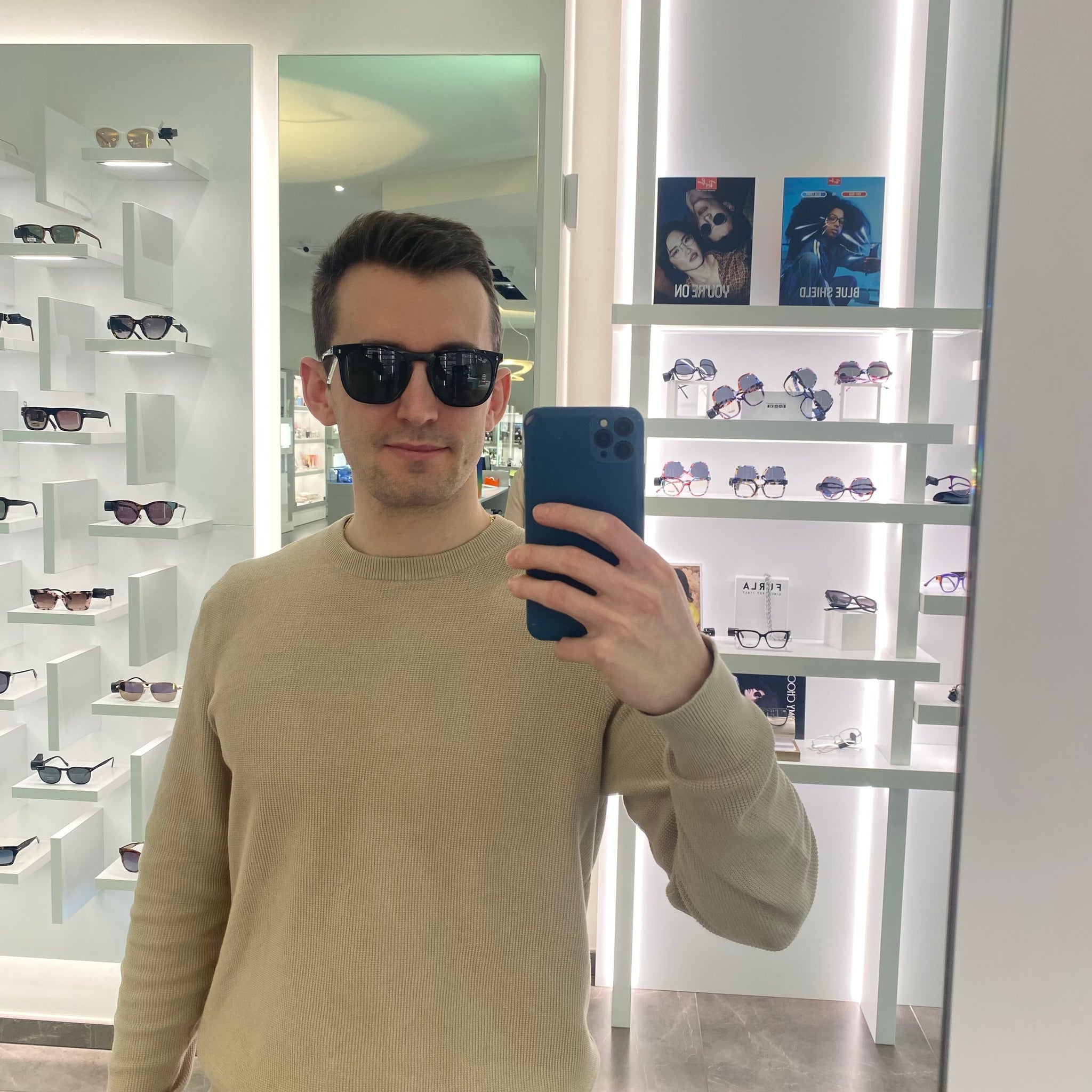 Occhiale da sole in acetato di celluloide nero con lente verde polarizzata.