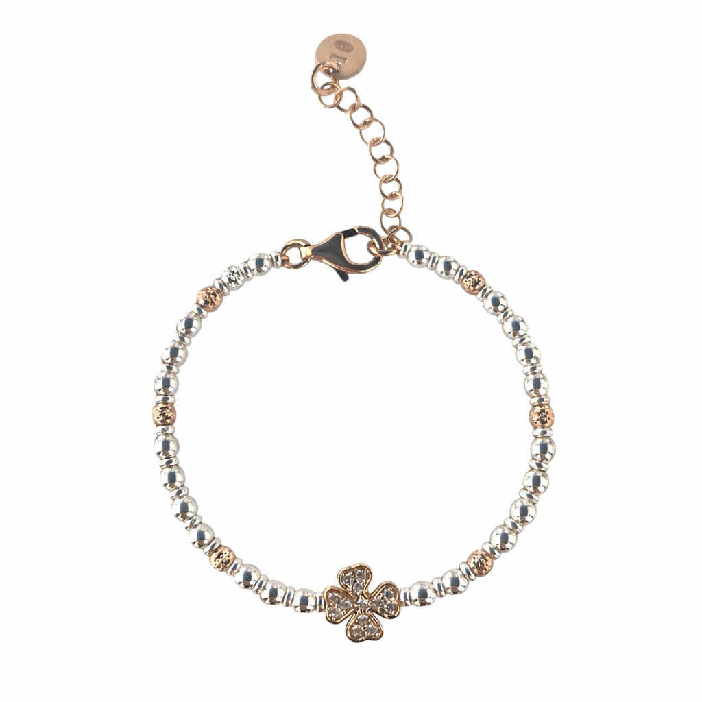 Bracciale in argento 925% con pepite placcate oro rosa con quadrifoglio centrale con zirconi incastonati.