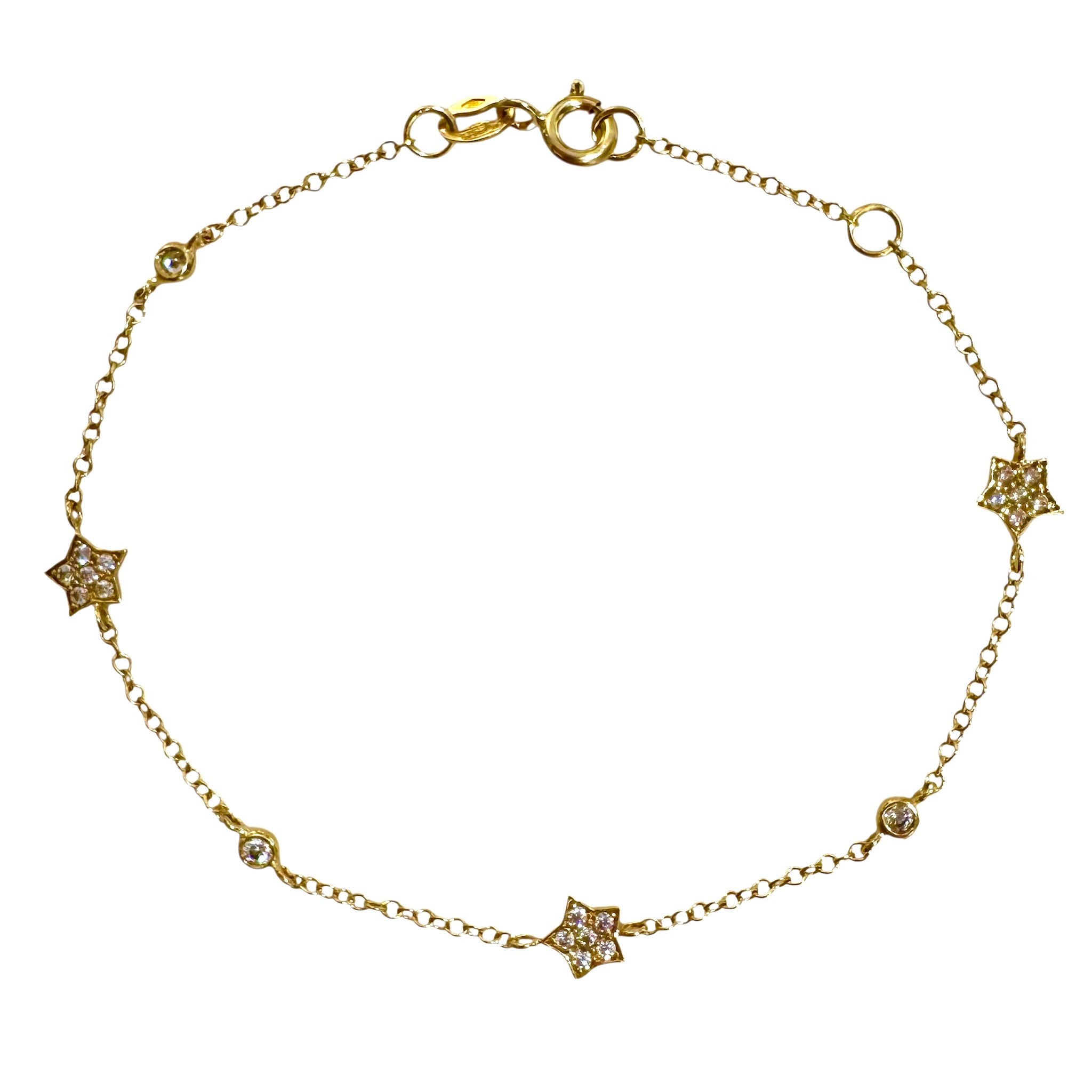 Bracciale in oro giallo 18KT/750% con tre ciondoli a forma di stella alternata da zirconi sulla catenella e incastonati su di esse.
