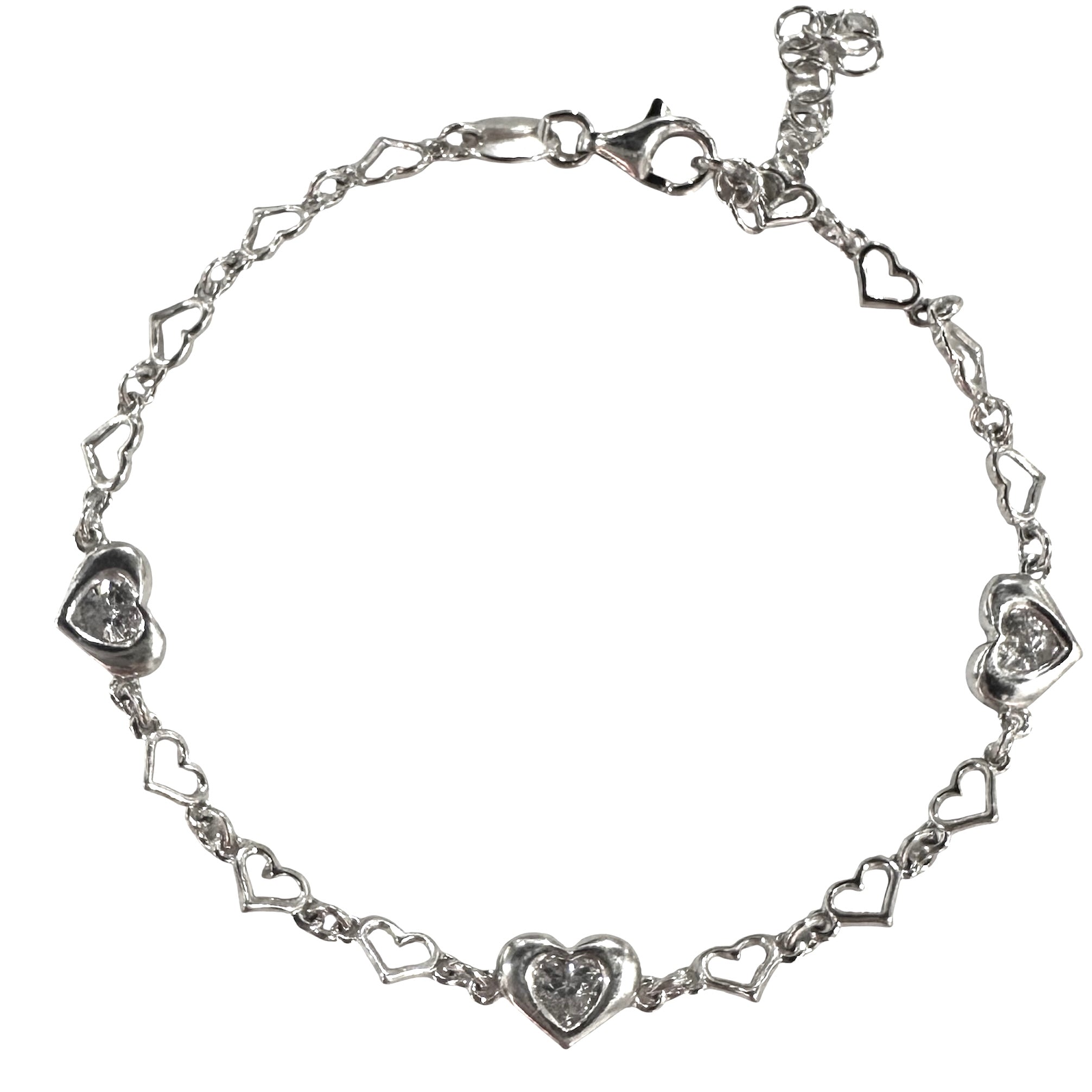 Bracciale in argento 925% a mini cuoricini incatenati con 3 cuori più grandi con 3 zirconi a forma di cuore incastonati all'interno.