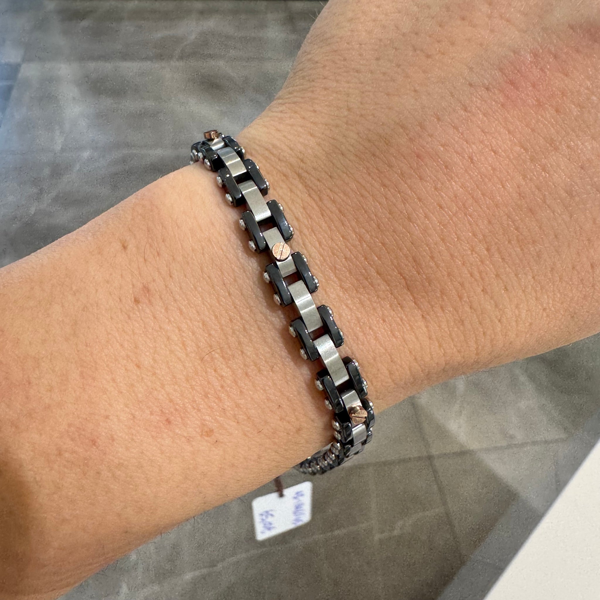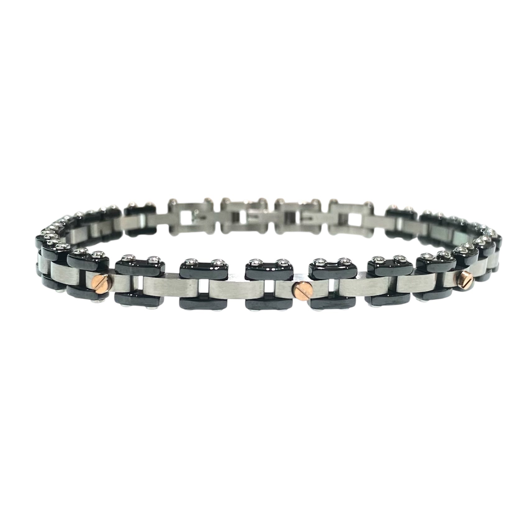 Bracciale da uomo in acciaio 316 L e ceramica nero con 3 chiodini placcati oro rosa su 3 placchette.