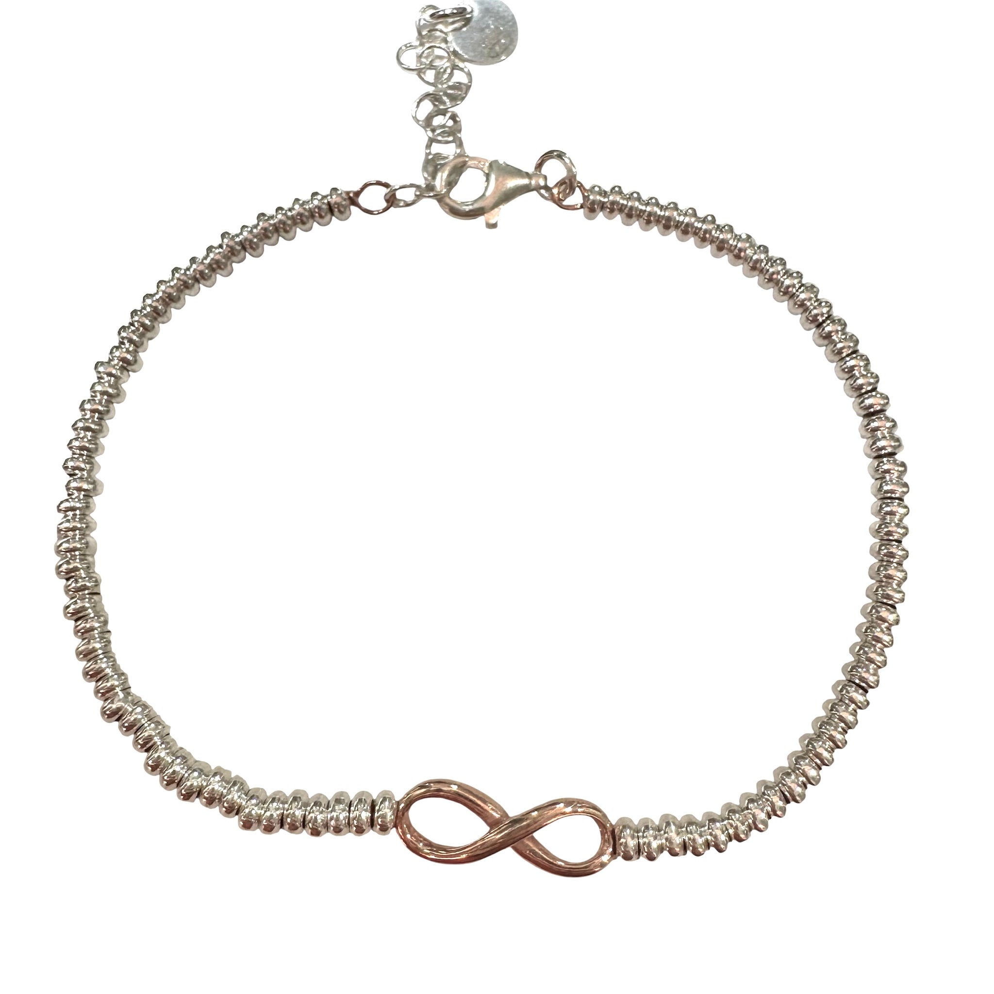 Bracciale in argento 925% composto da pepite e infinito liscio placcato oro rosa contrale.