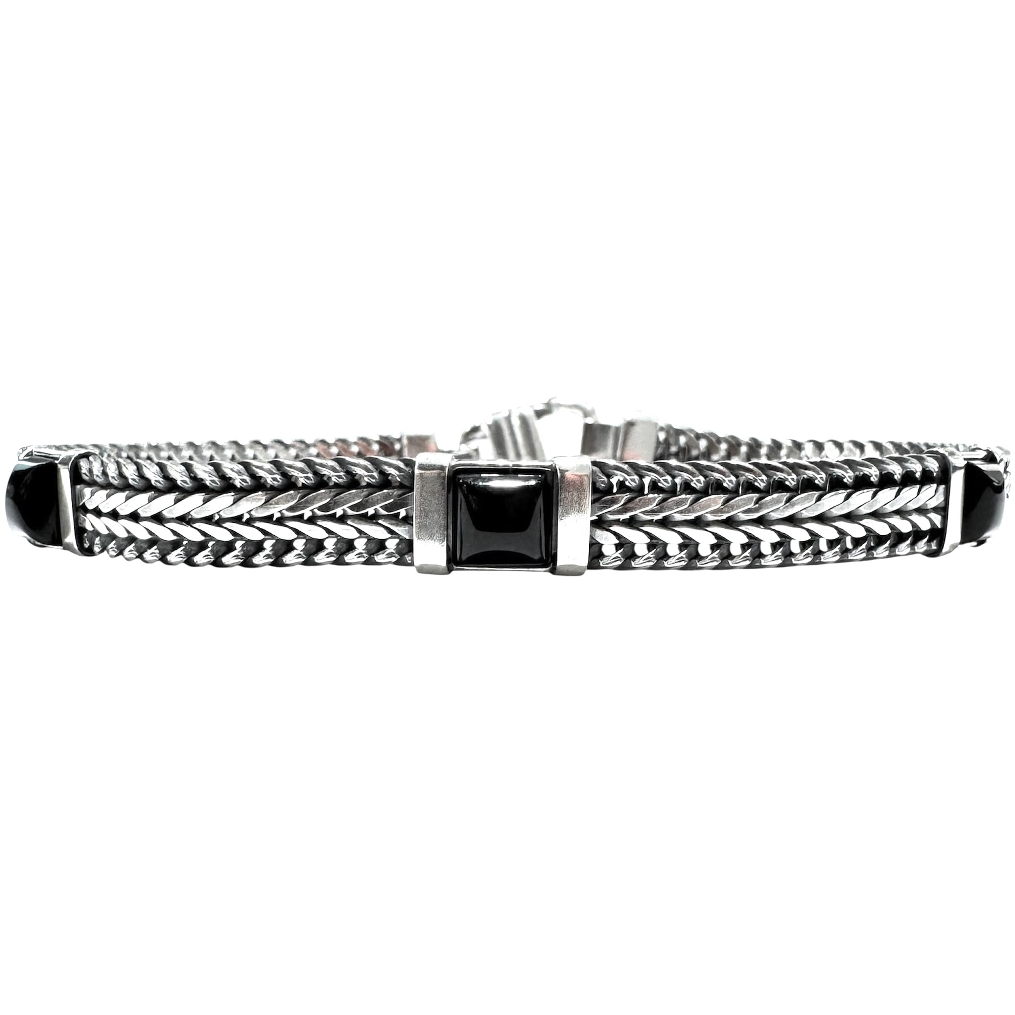 Bracciale in argento 925% leggermente brunito con maglia piatta e intrecciata con 3 Onici posizionati in un castone quadrato.