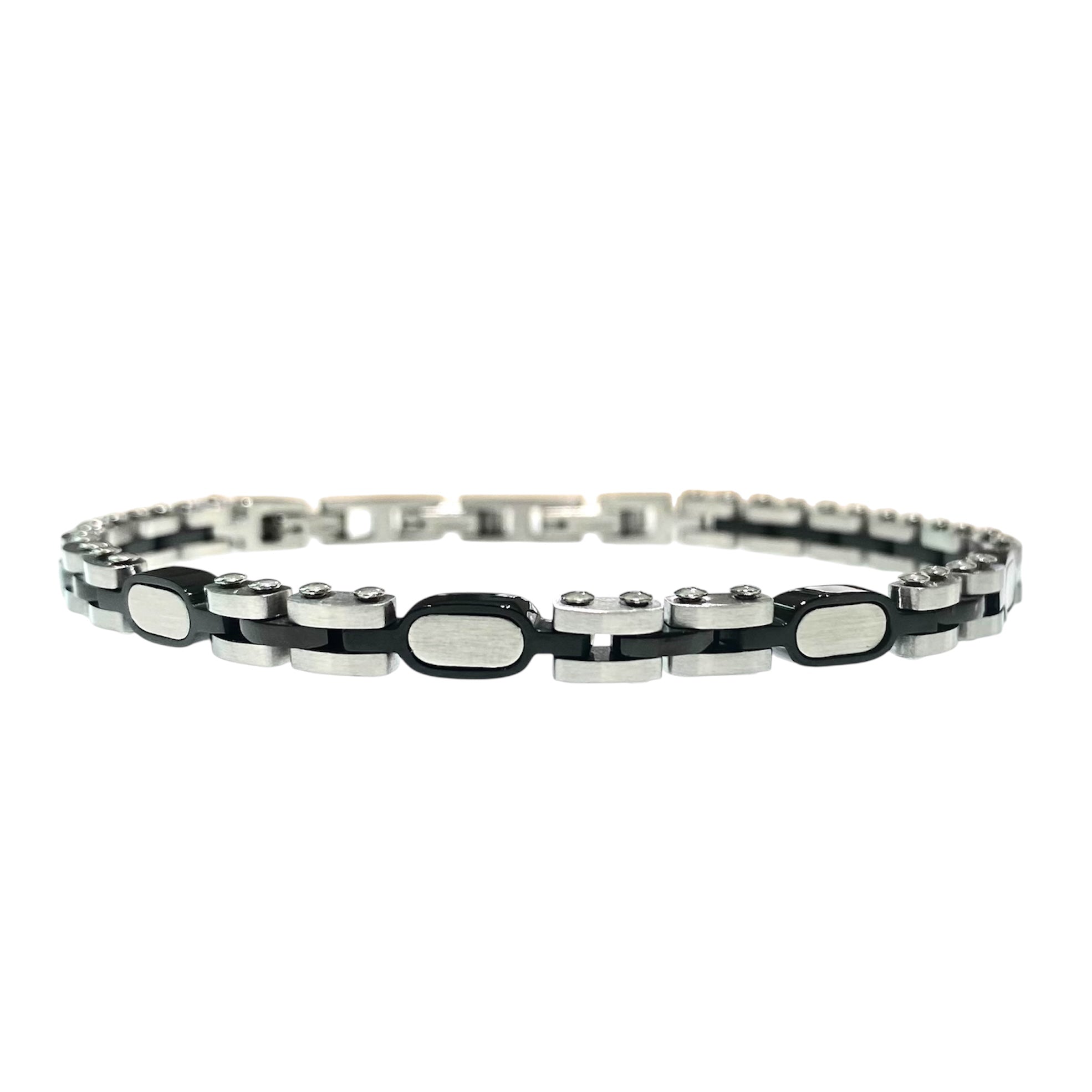 Bracciale da uomo in acciaio 316 L in maglia bicolore alternata da ovalini piatti ribordati di nero.
