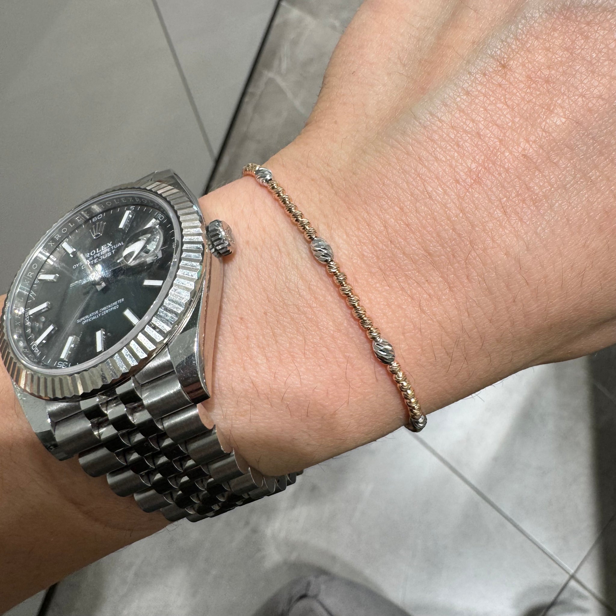 Bracciale in oro rosa e bianco 18KT/750% con palline lavorate alternate a ovali oro bianco e chiusura a moschettone.