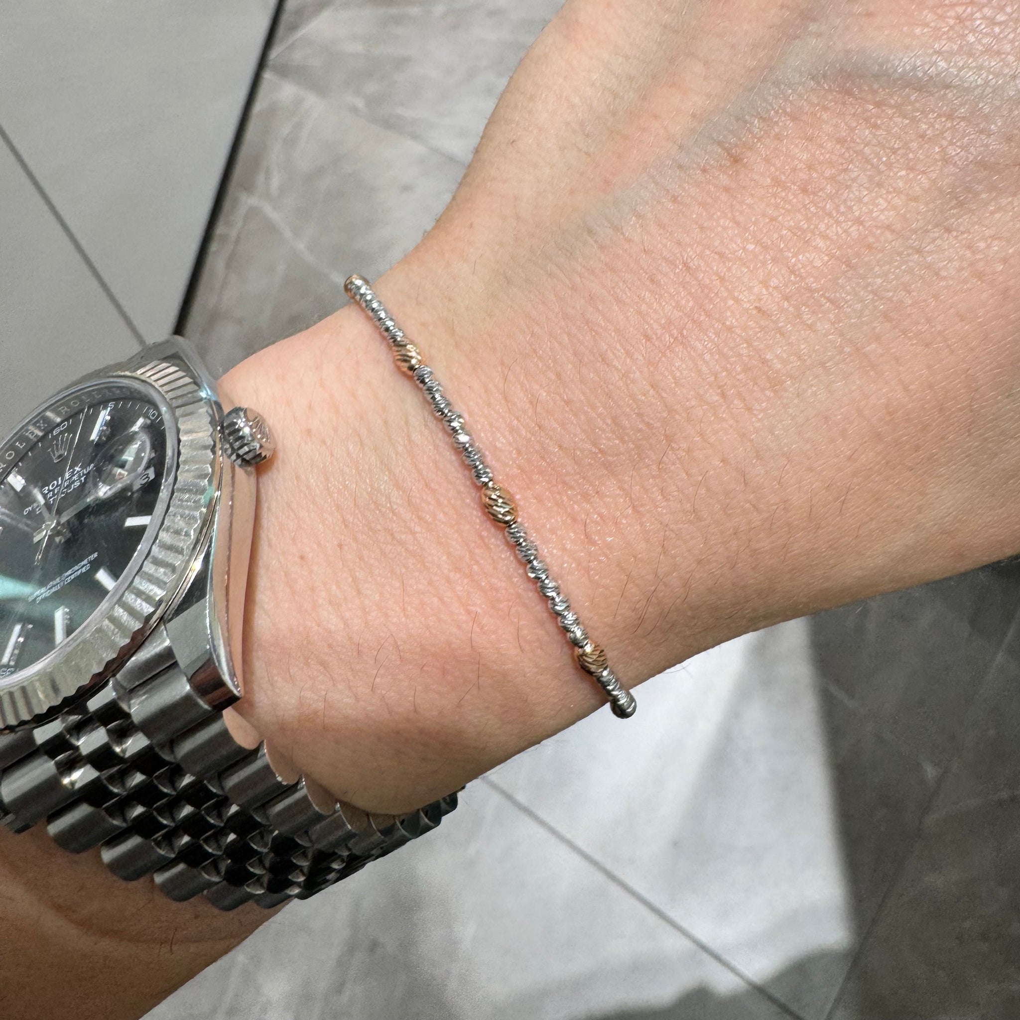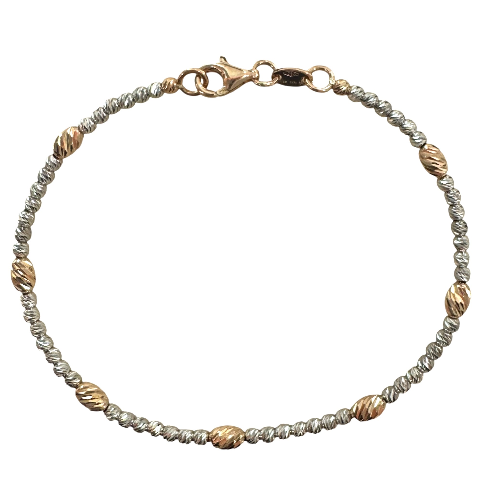 Bracciale in oro bianco e rosa 18KT/750% con palline alternate a ovali con lavorazione diamantata e chiusura a moschettone.