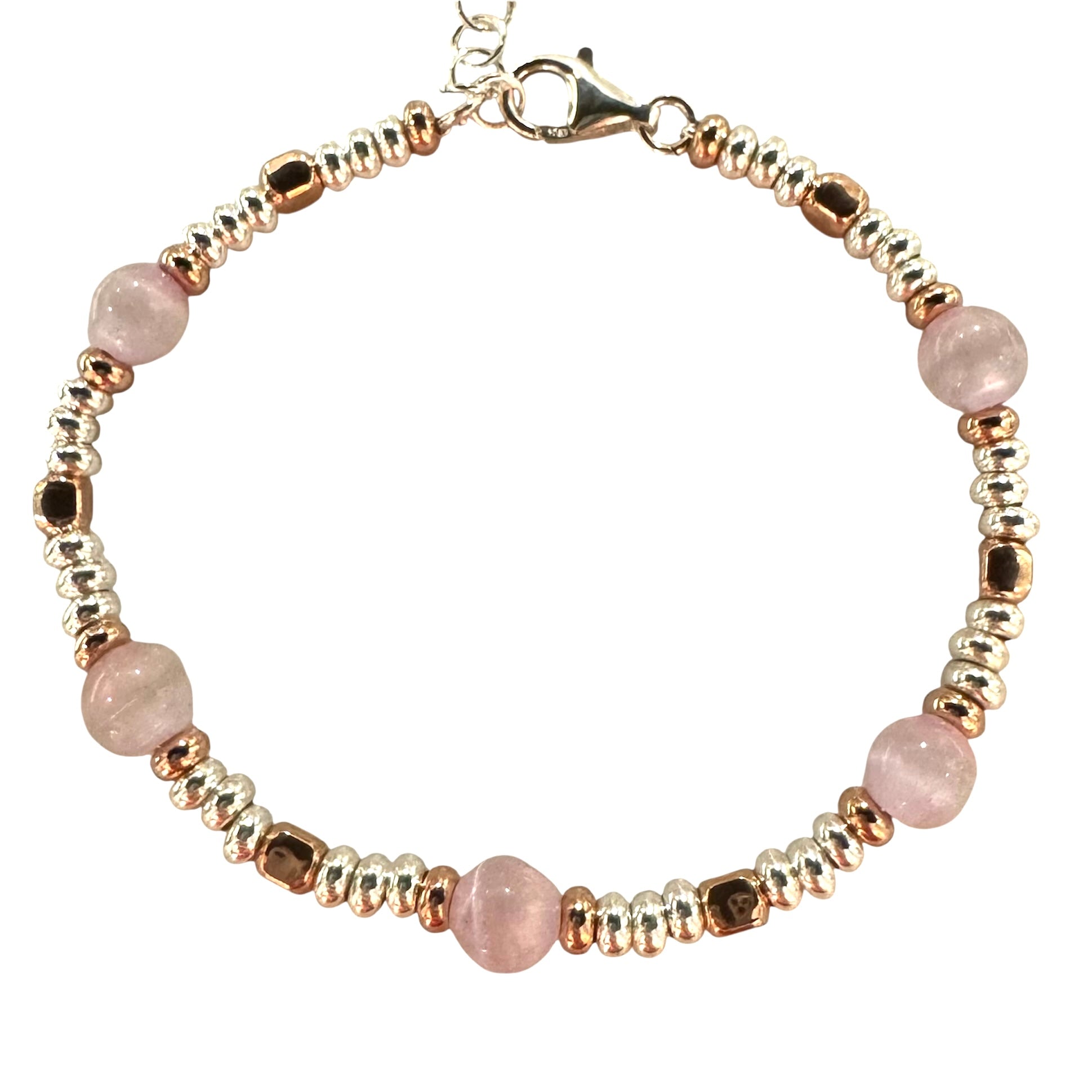 Bracciale in argento 925% composto da pepite in argento alternate a pepite placcate oro rosa alternate a sfere di pietre naturali.
