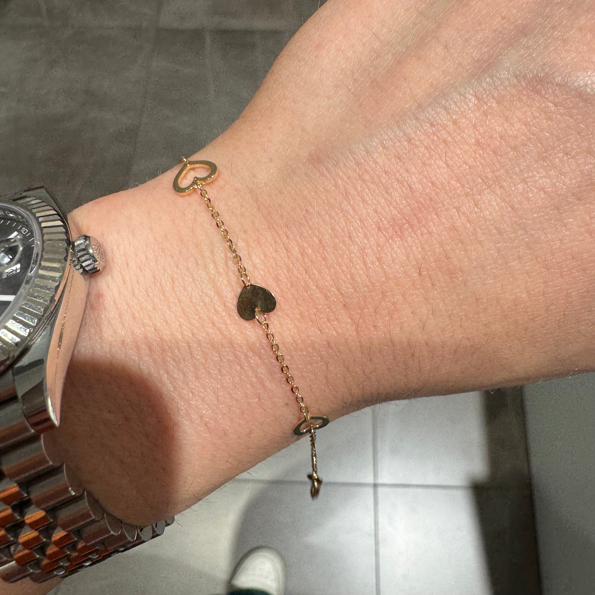 Bracciale in oro giallo 18KT/750% con cinque cuori sulla lunghezza a latra e cuori di contorno alternati e chiusura a moschettone.