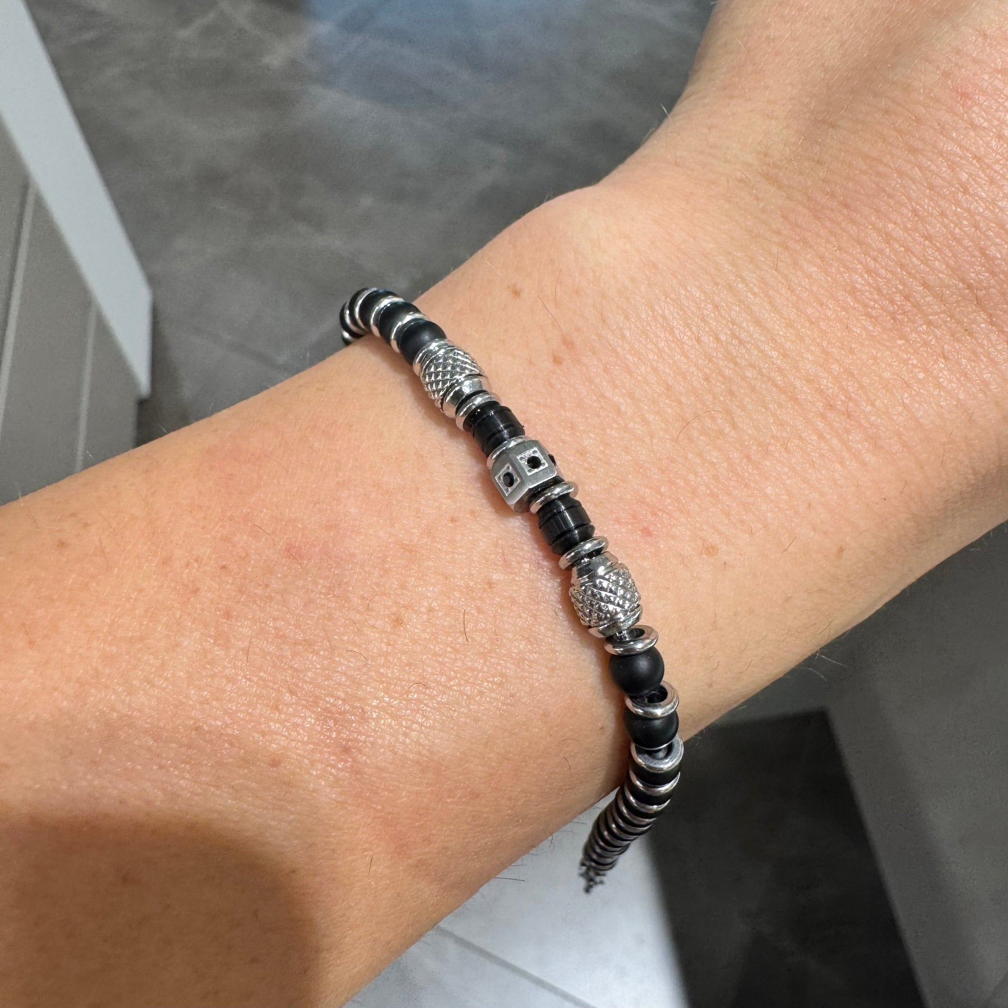 Bracciale da uomo in acciaio 316 L composto da sfere nere opache e altri charm acciaio nella parte centrale su cui sono incastonati anche zirconi neri.