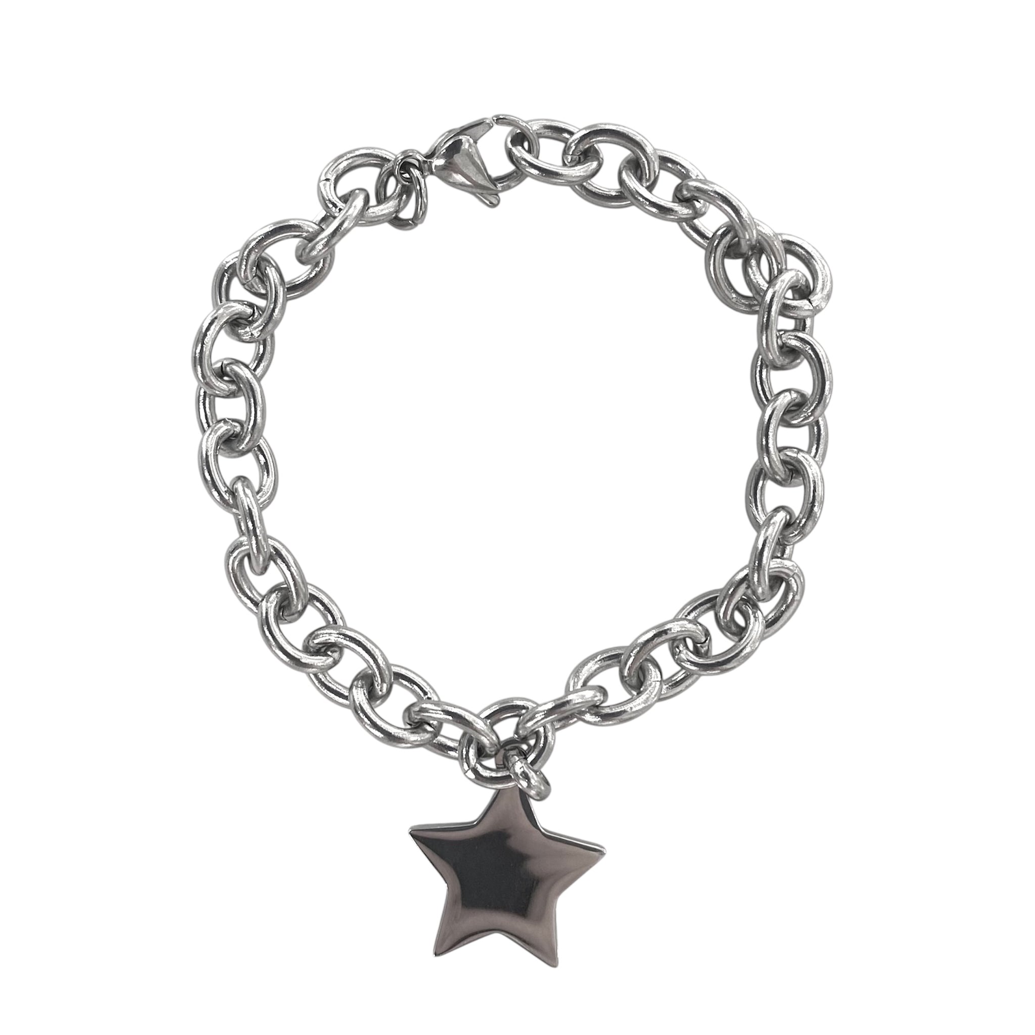 Bracciale in acciaio 316L con maglia a catena e con una grossa stella pendente e liscia su cui c'è la possibilità di fare un'incisione.
