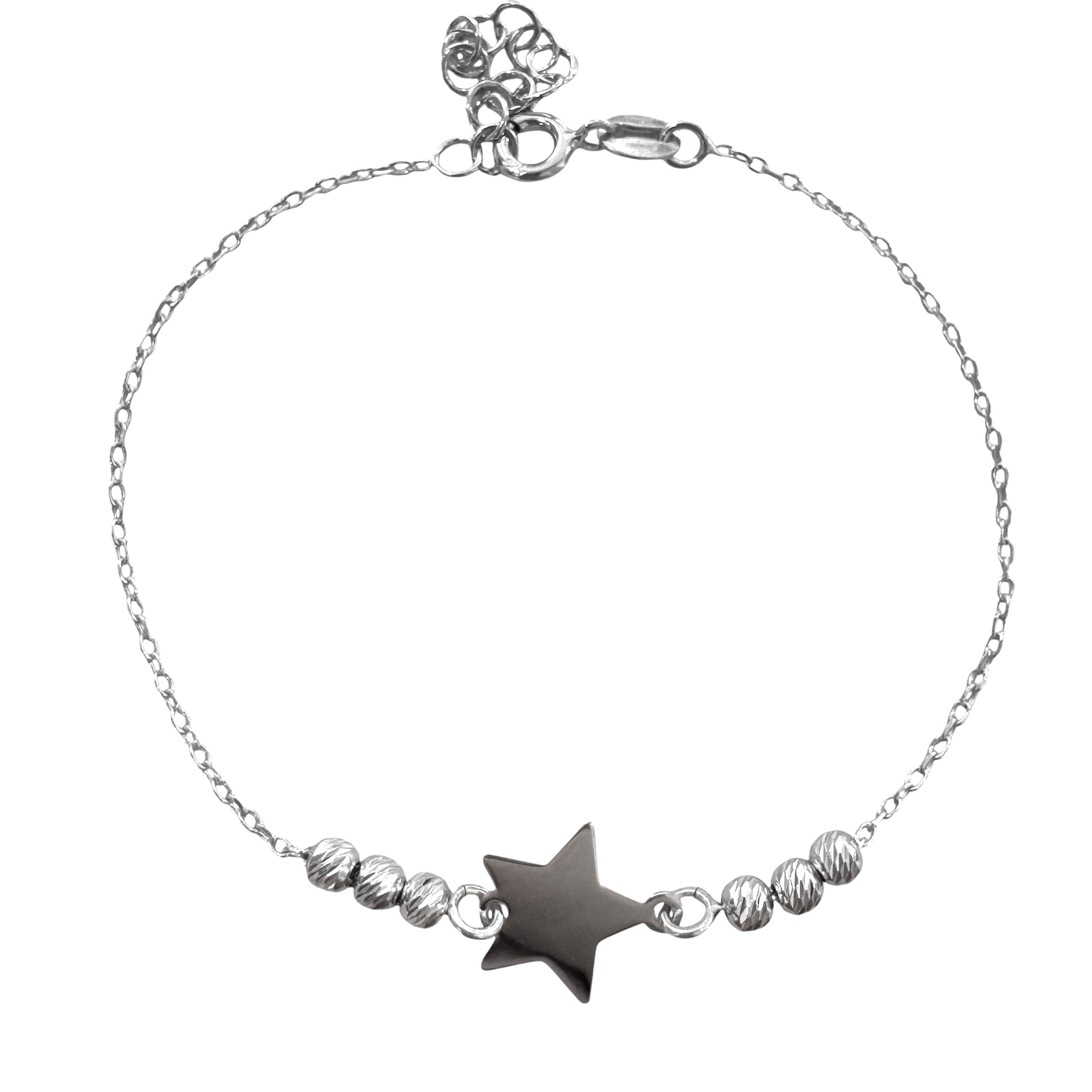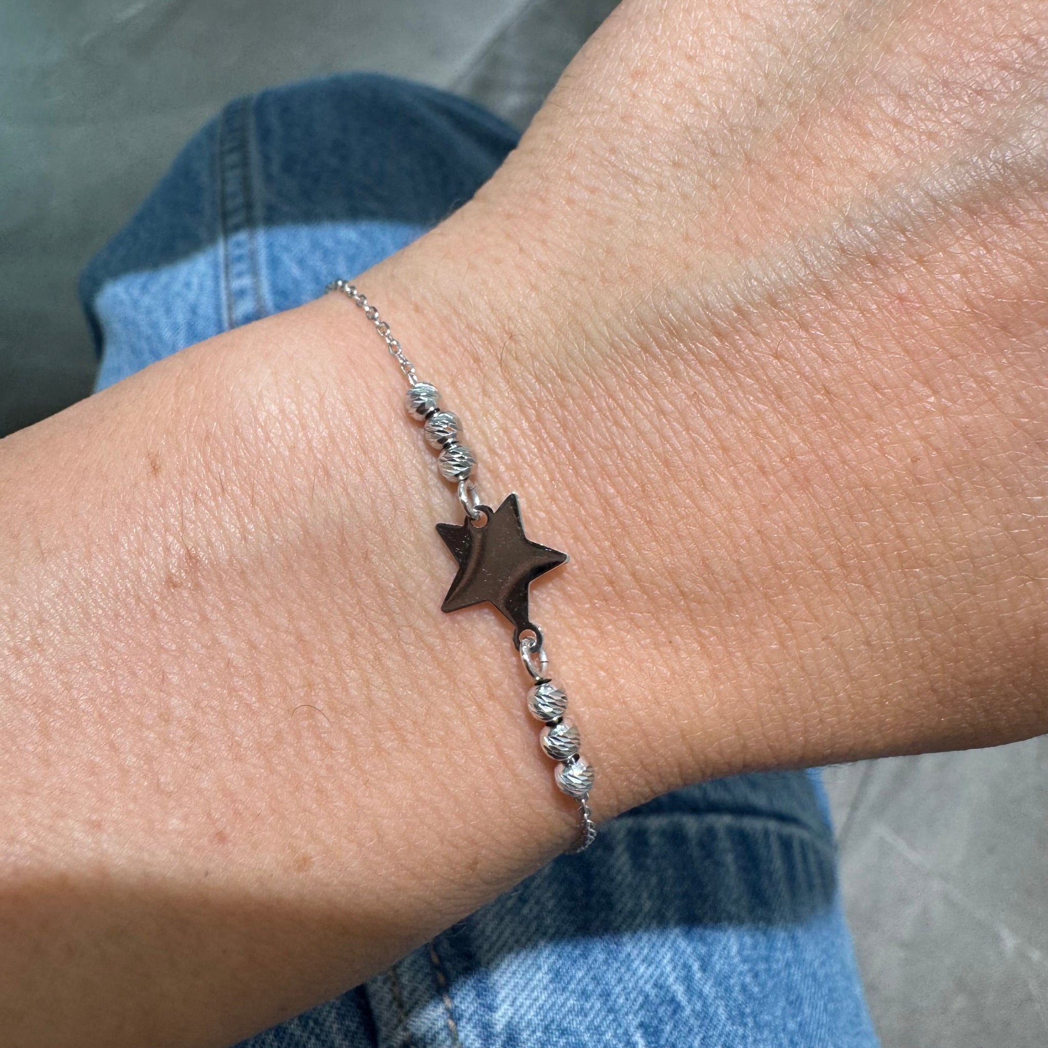 Bracciale in argento 925% a catenella con stella liscia, centrale e piatta personalizzabile con un'incisione, posta tra 6 sfere con lavorazione diamantata.