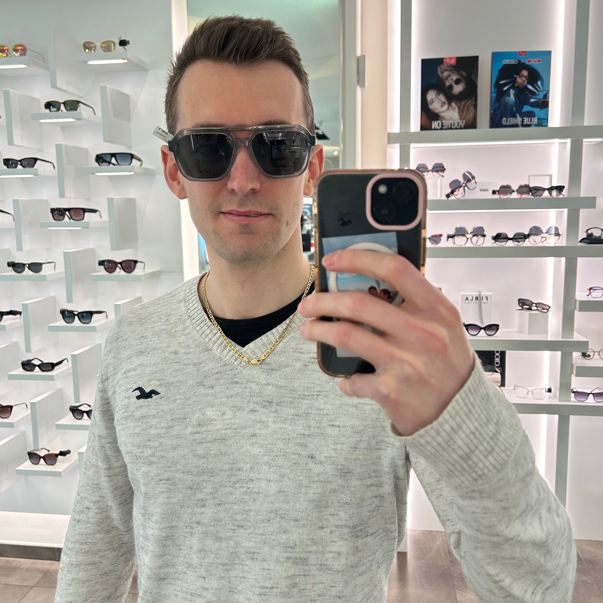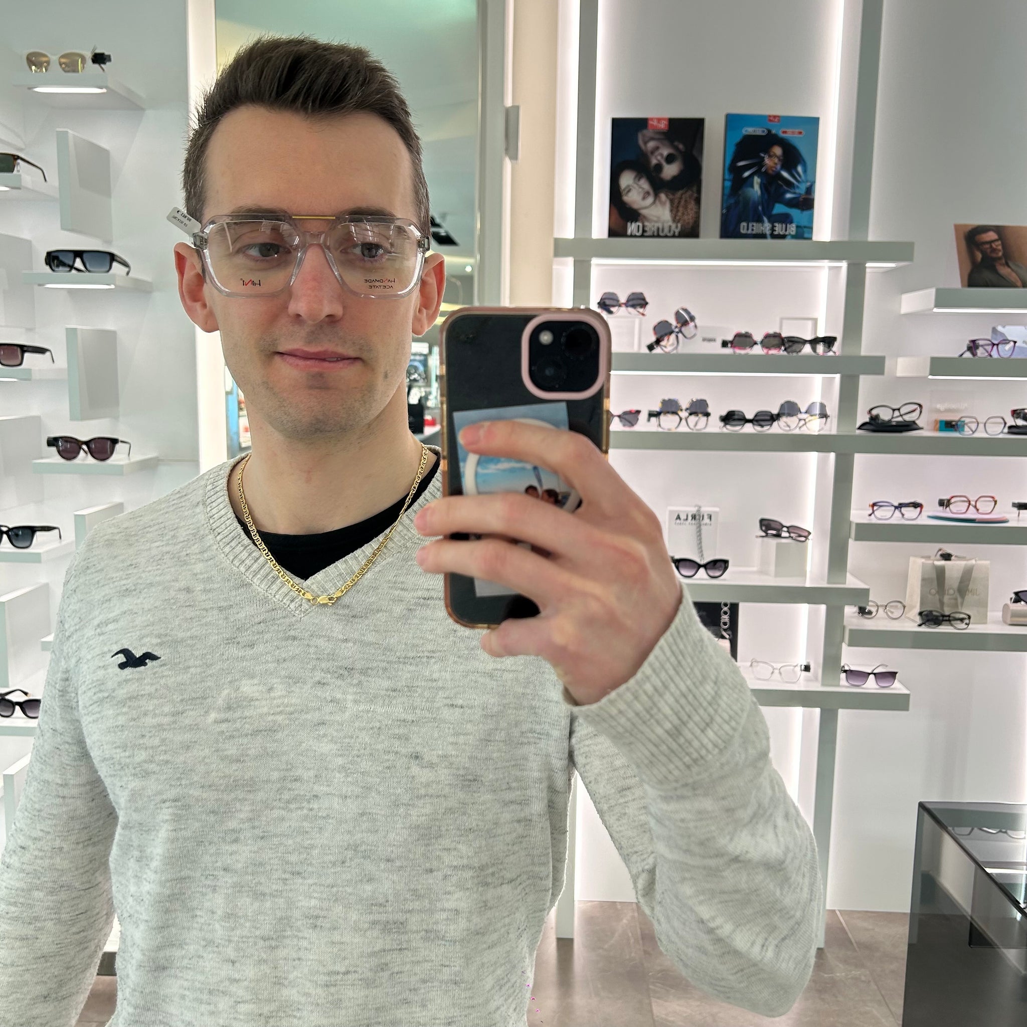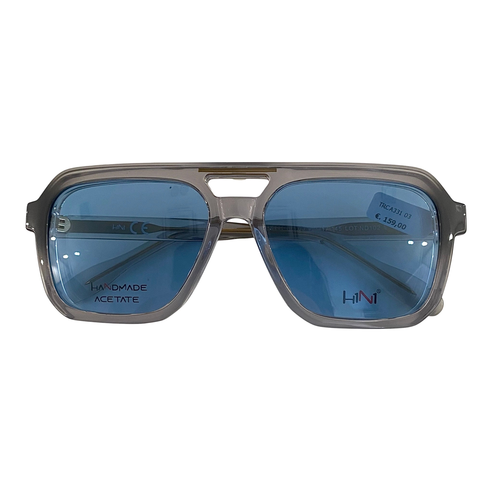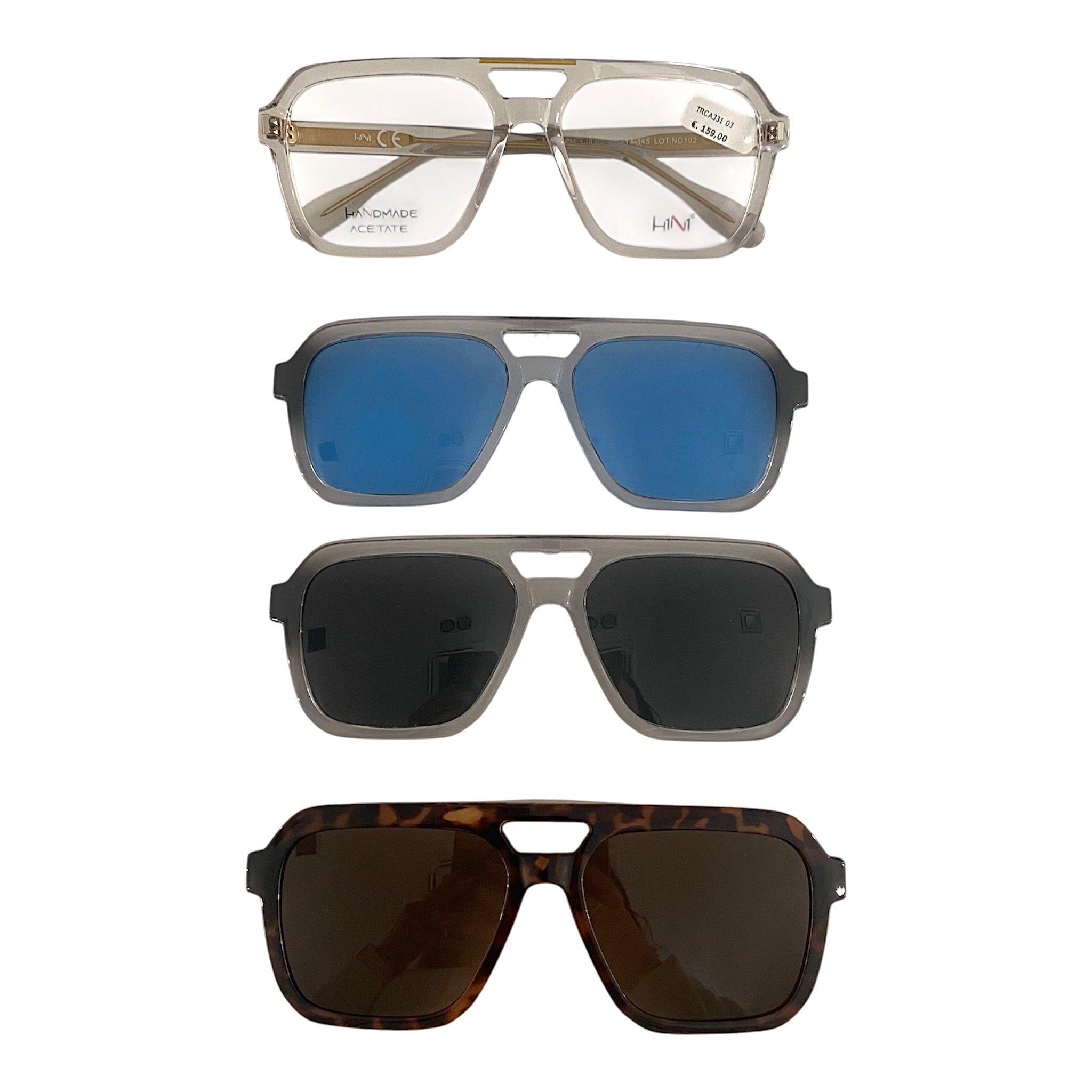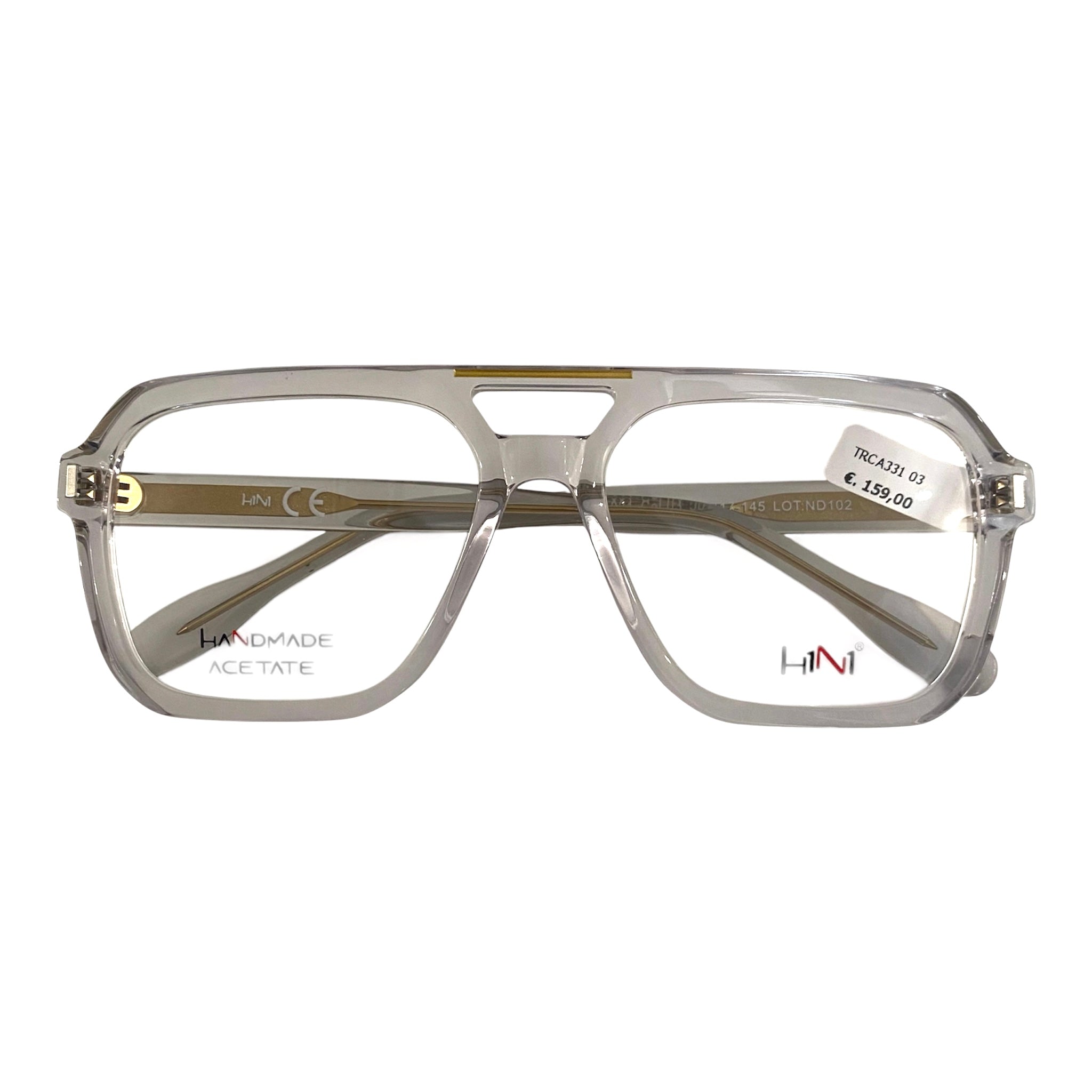 Occhiale da vista/sole in celluloide trasparente con doppio ponte e dettagli oro. Comprende tre clip on polarizzate.