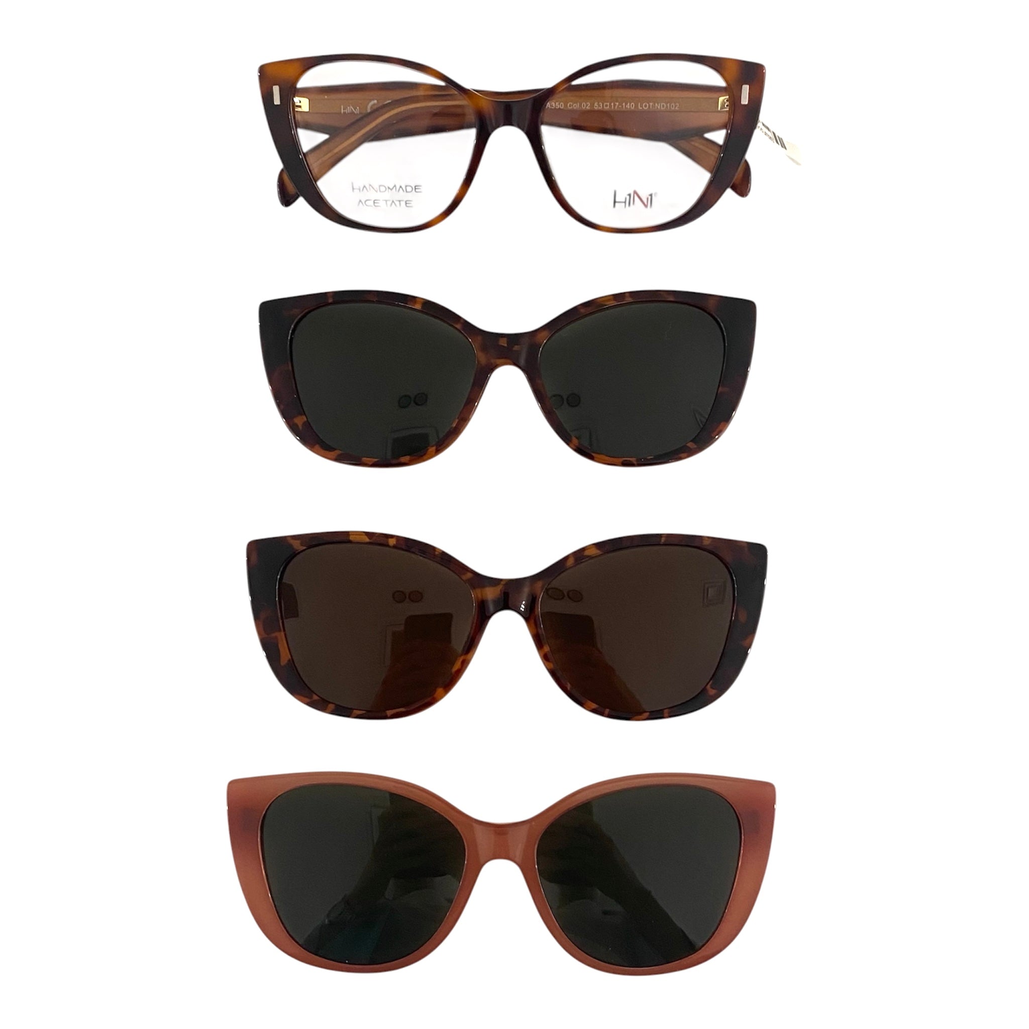 Occhiale da vista/sole havana, con dettagli sulle aste rosa. Tre clip on comprese polarizzate.