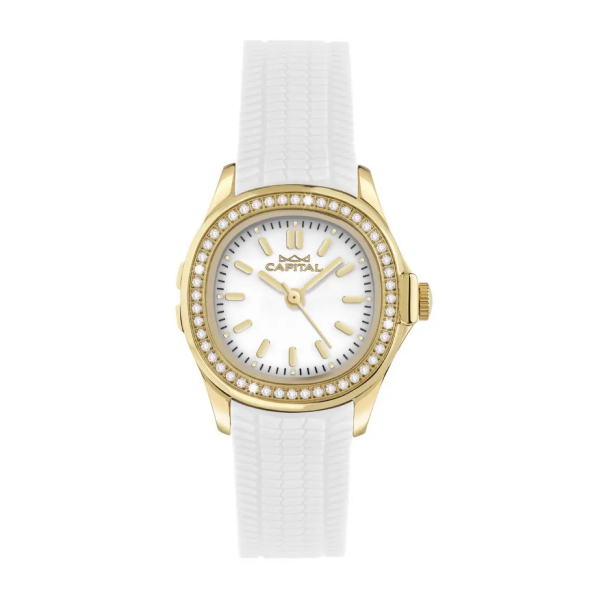 Orologio Capital Donna con movimento al quarzo Miyota, cassa in acciaio Gold da 28 mm, ghiera con pietre e cinturino in silicone bianco. Eleganza e praticità, impermeabile 5 ATM.