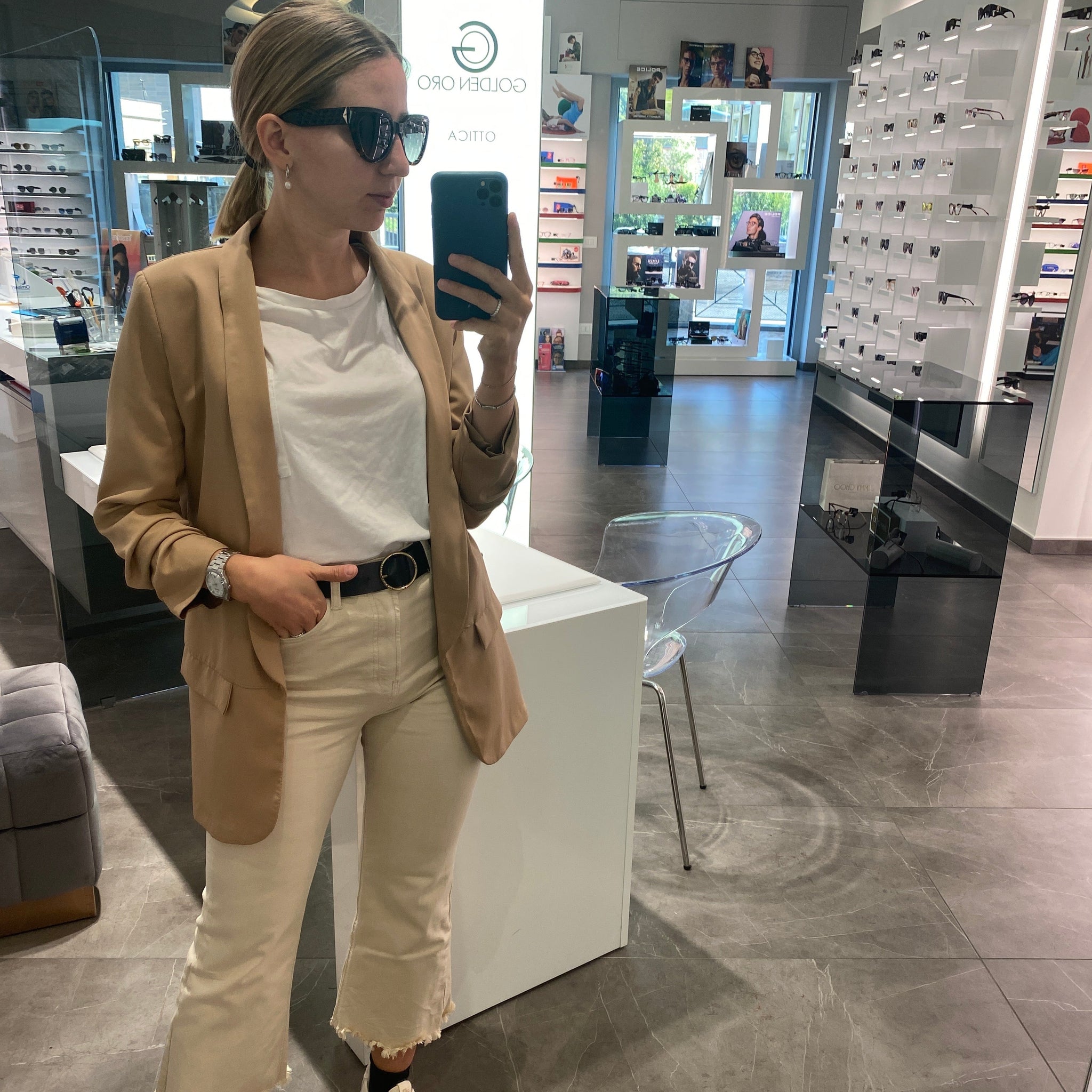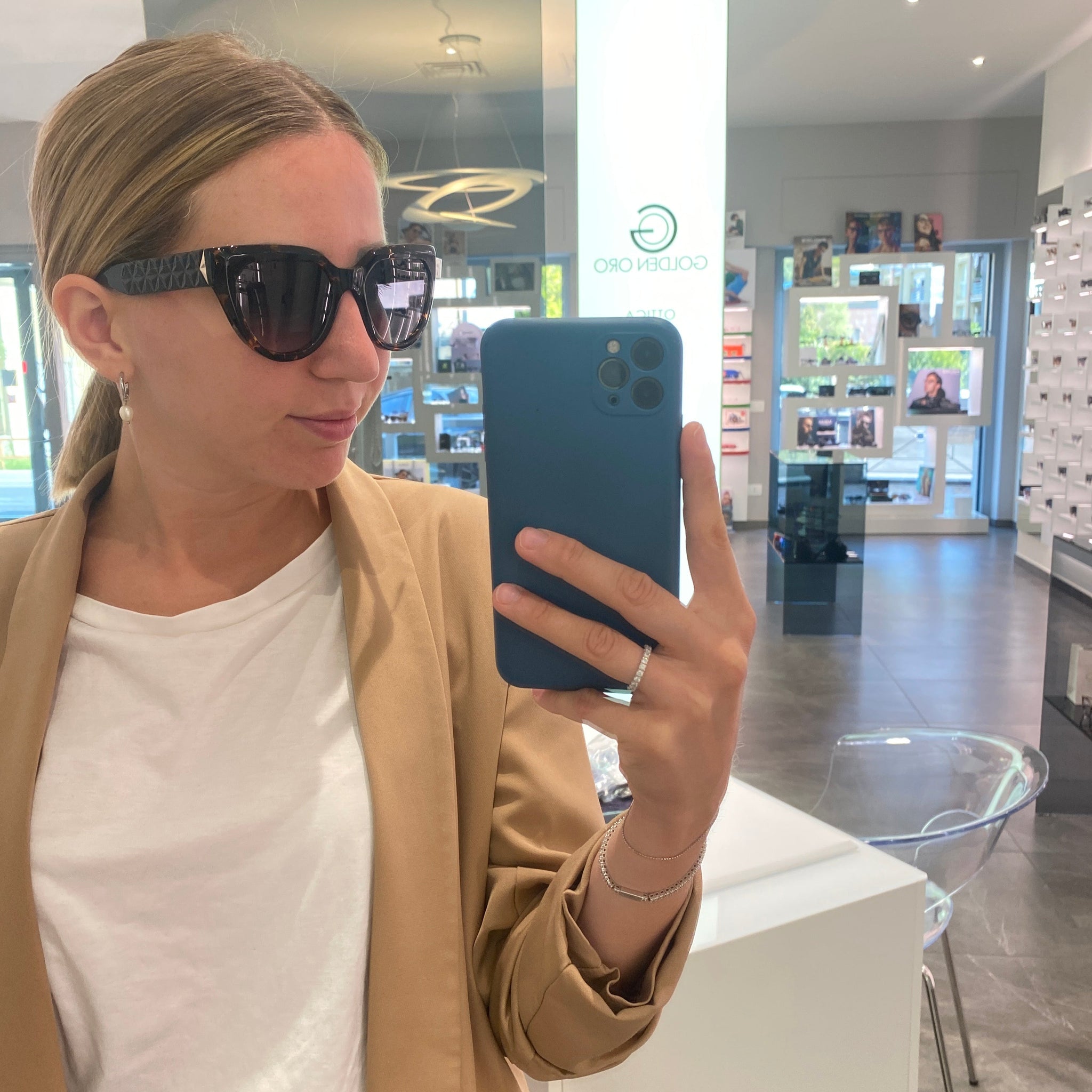 Occhiale da sole in acetato di celluloide a forma di farfalla maculato con asta lavorata marrone.