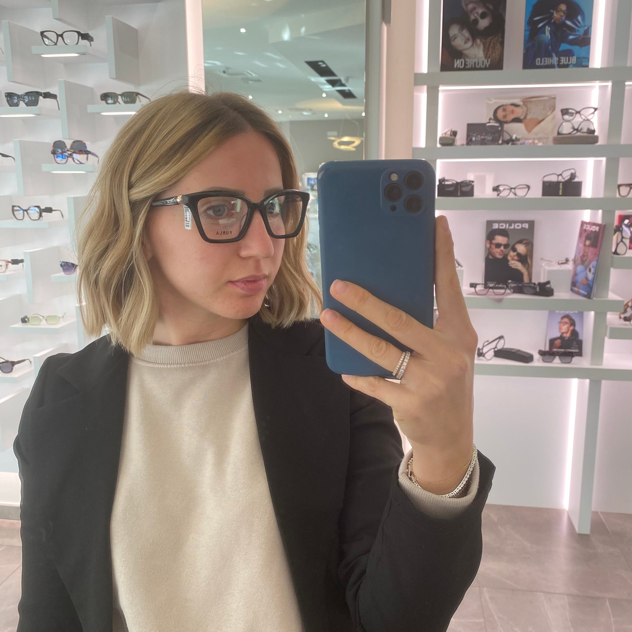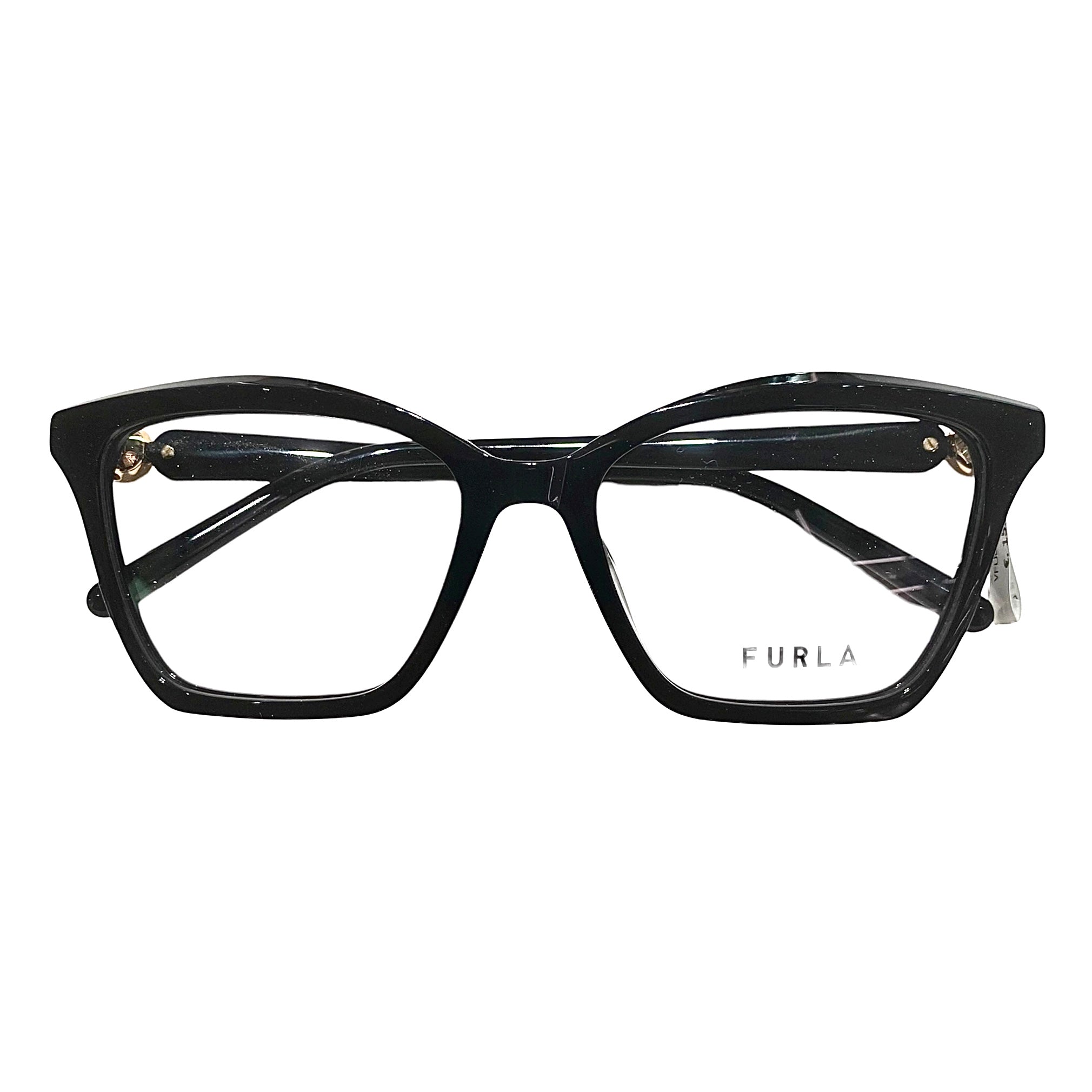 Occhiale da vista in acetato di celluloide nero con palla dorata sull'asta.