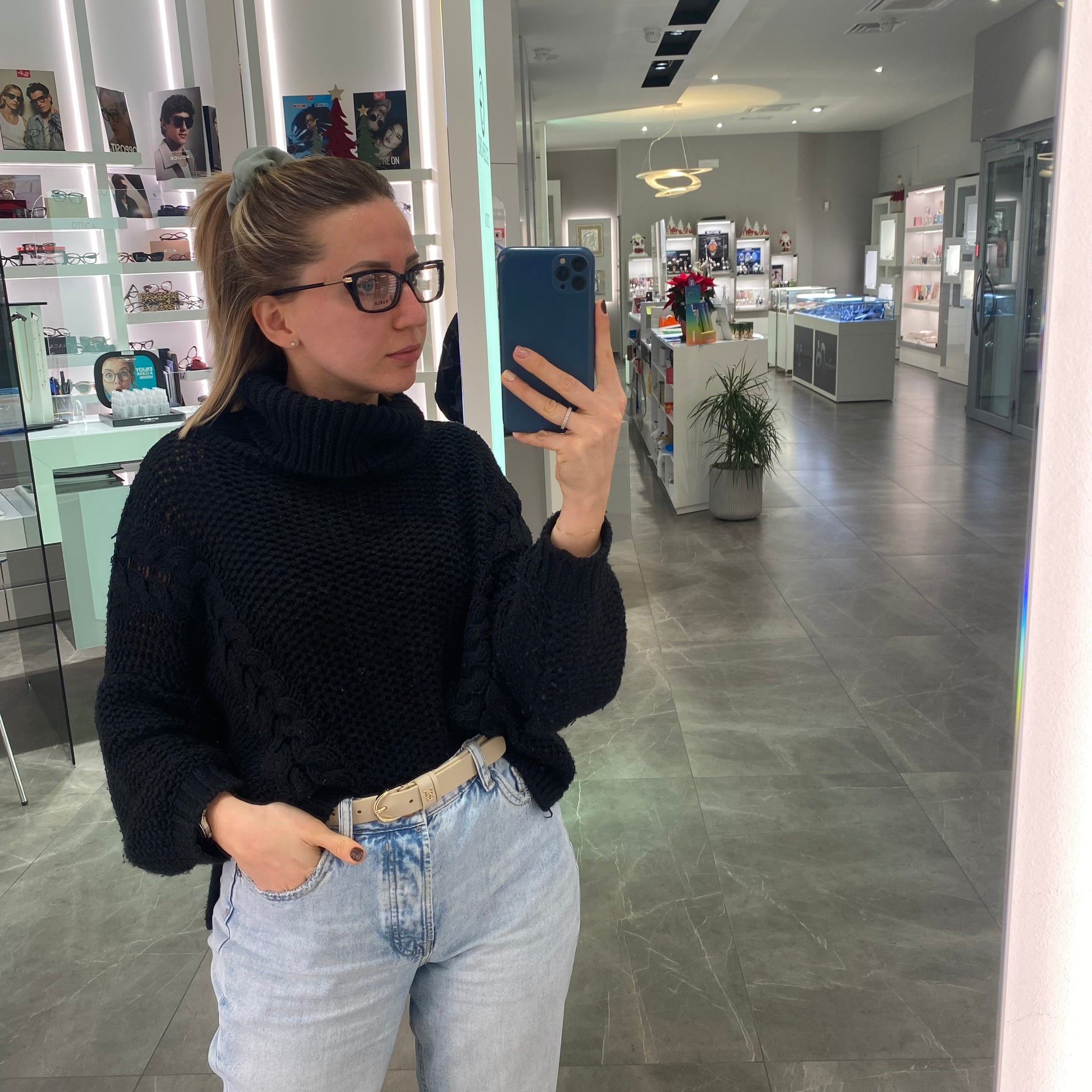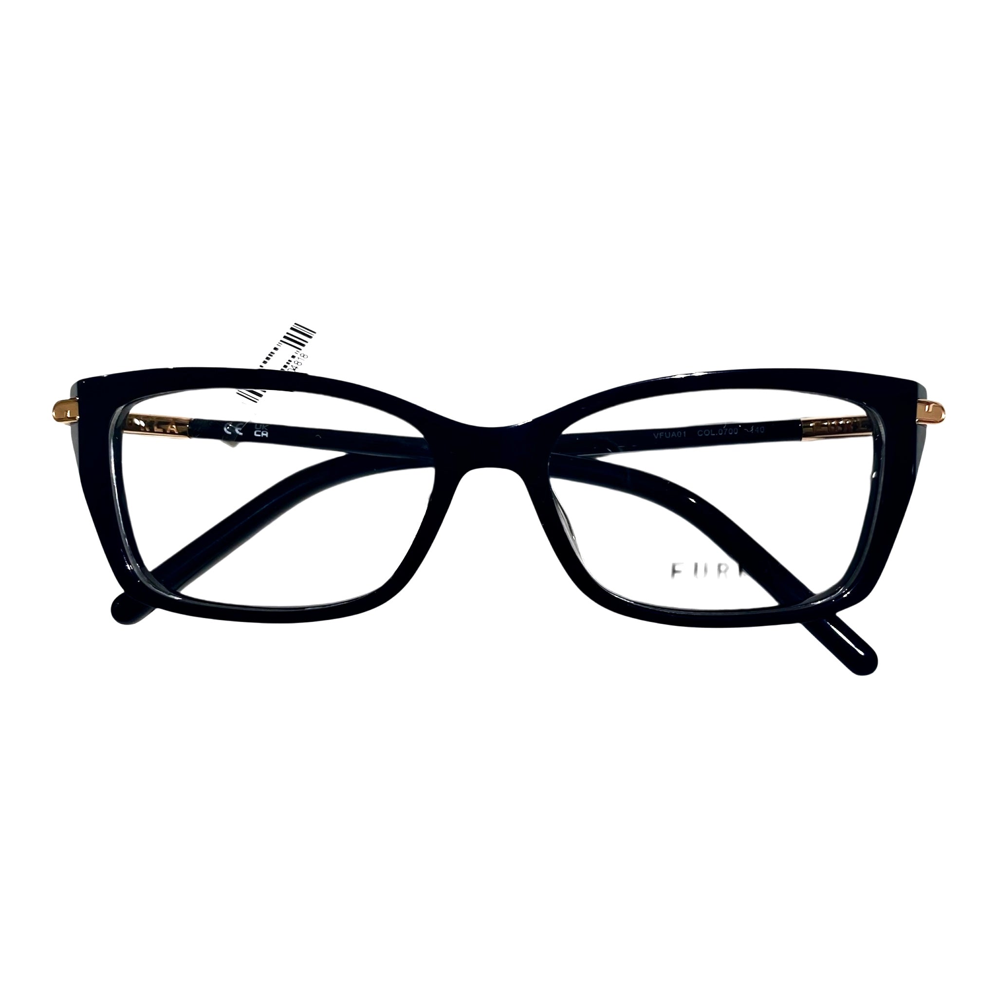 Occhiale da vista in acetato di celluloide nero e dettaglio dorato sull'asta.