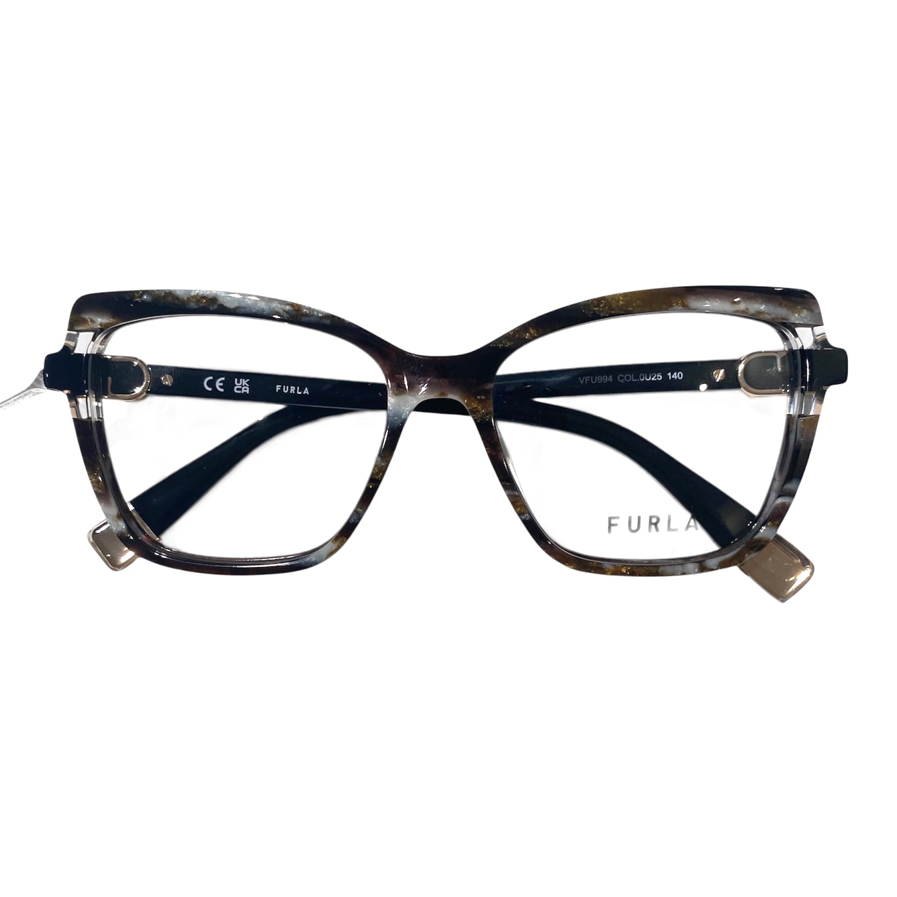 Occhiale da vista in acetato di celluloide con lastra marmorizzata marrone, bianca e nera. Logo dorato.