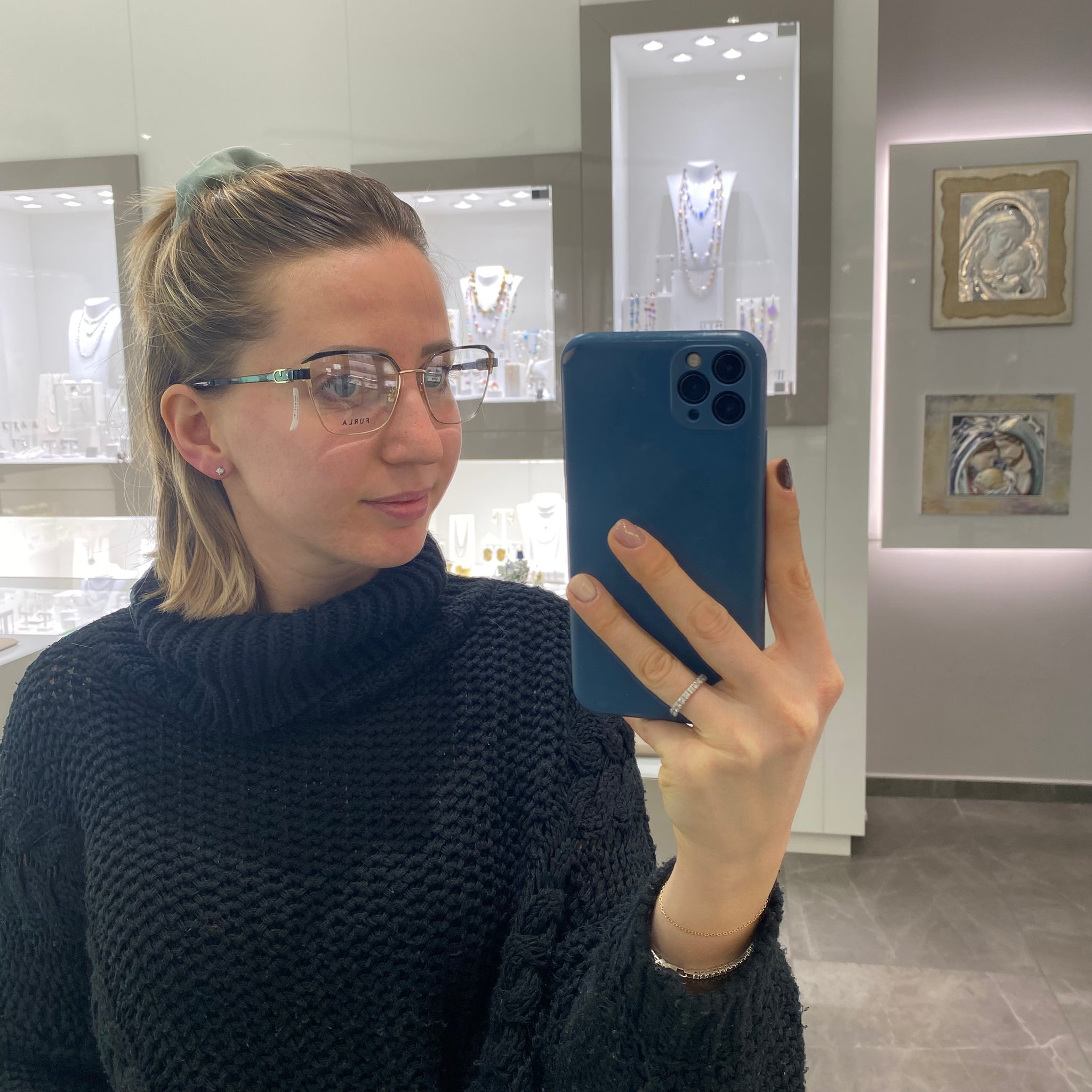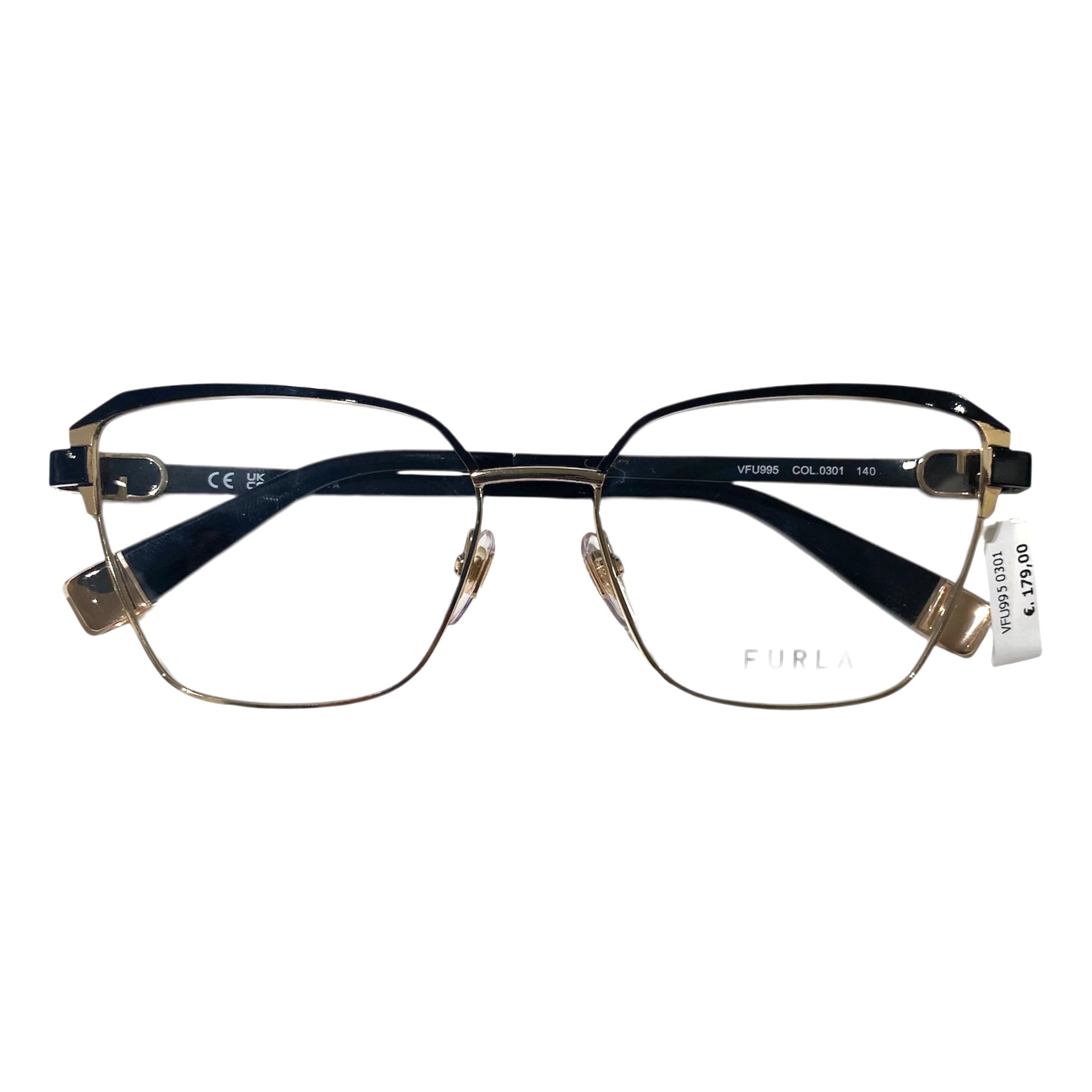 Occhiale da vista in metallo dorato con ciliare e aste nere.