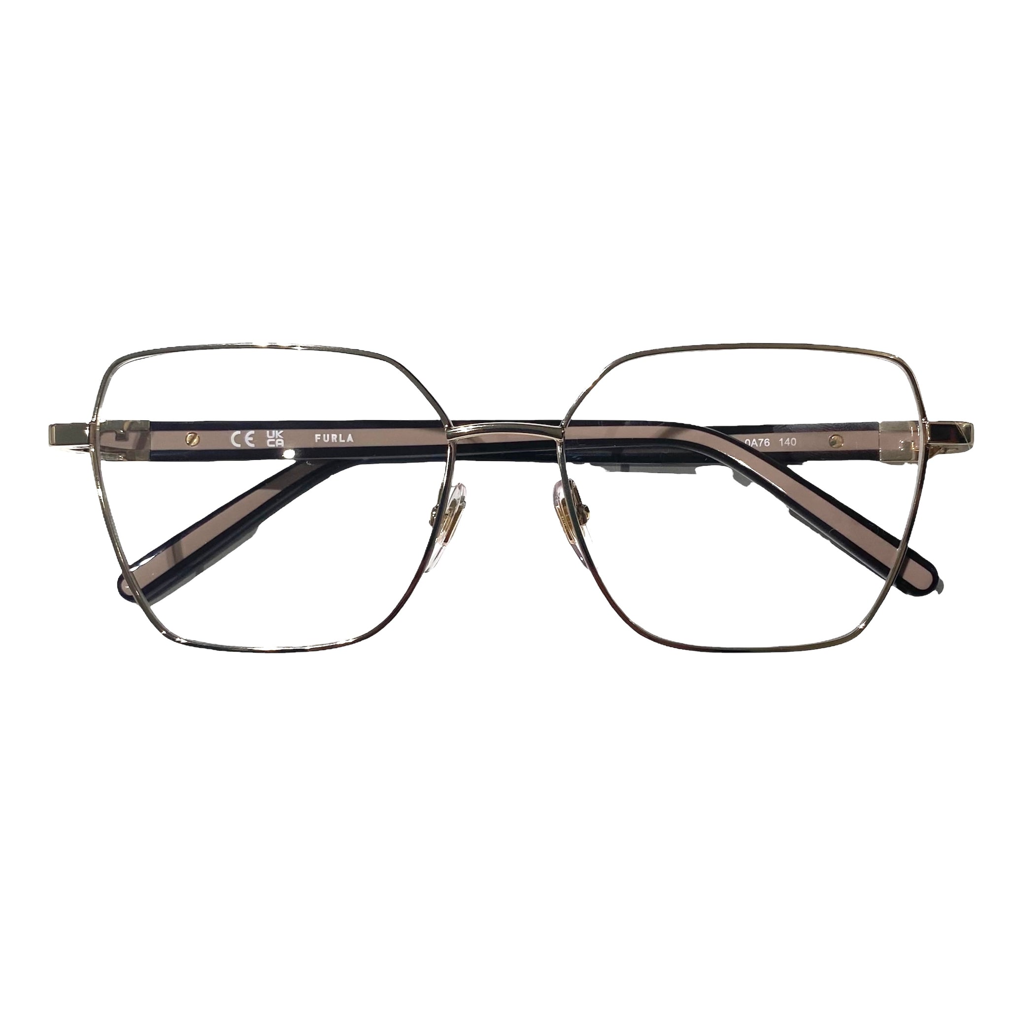 Occhiale da vista in metallo dorato a forma quadrata, con contorno bordeaux e cipria. Aste bordeaux con inserto cipria, logo dorato.