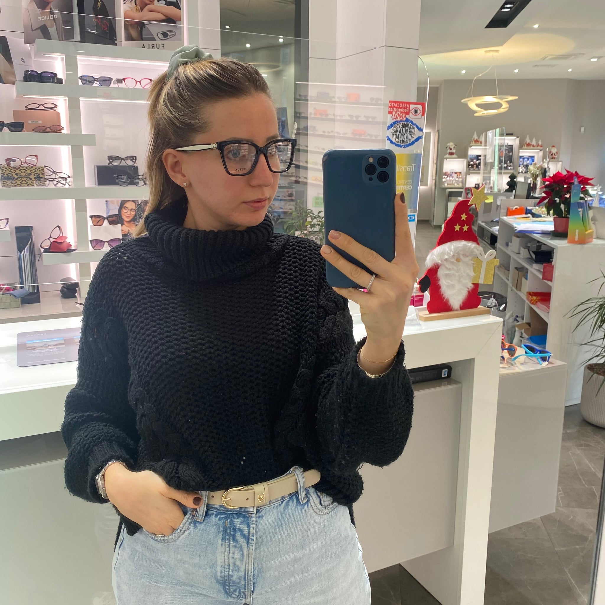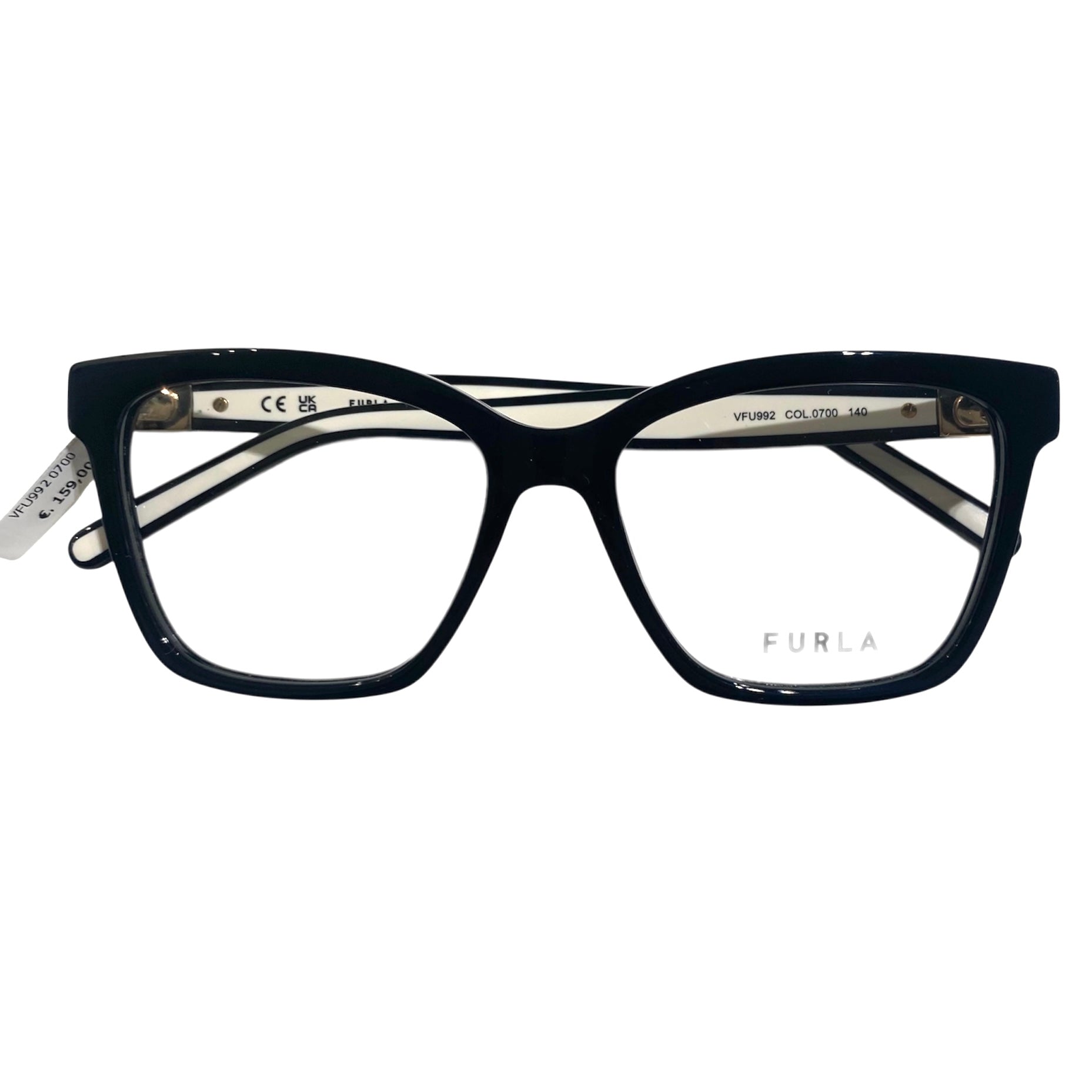 Occhiale da vista in acetato di celluloide nero con asta bianca e logo dorato.