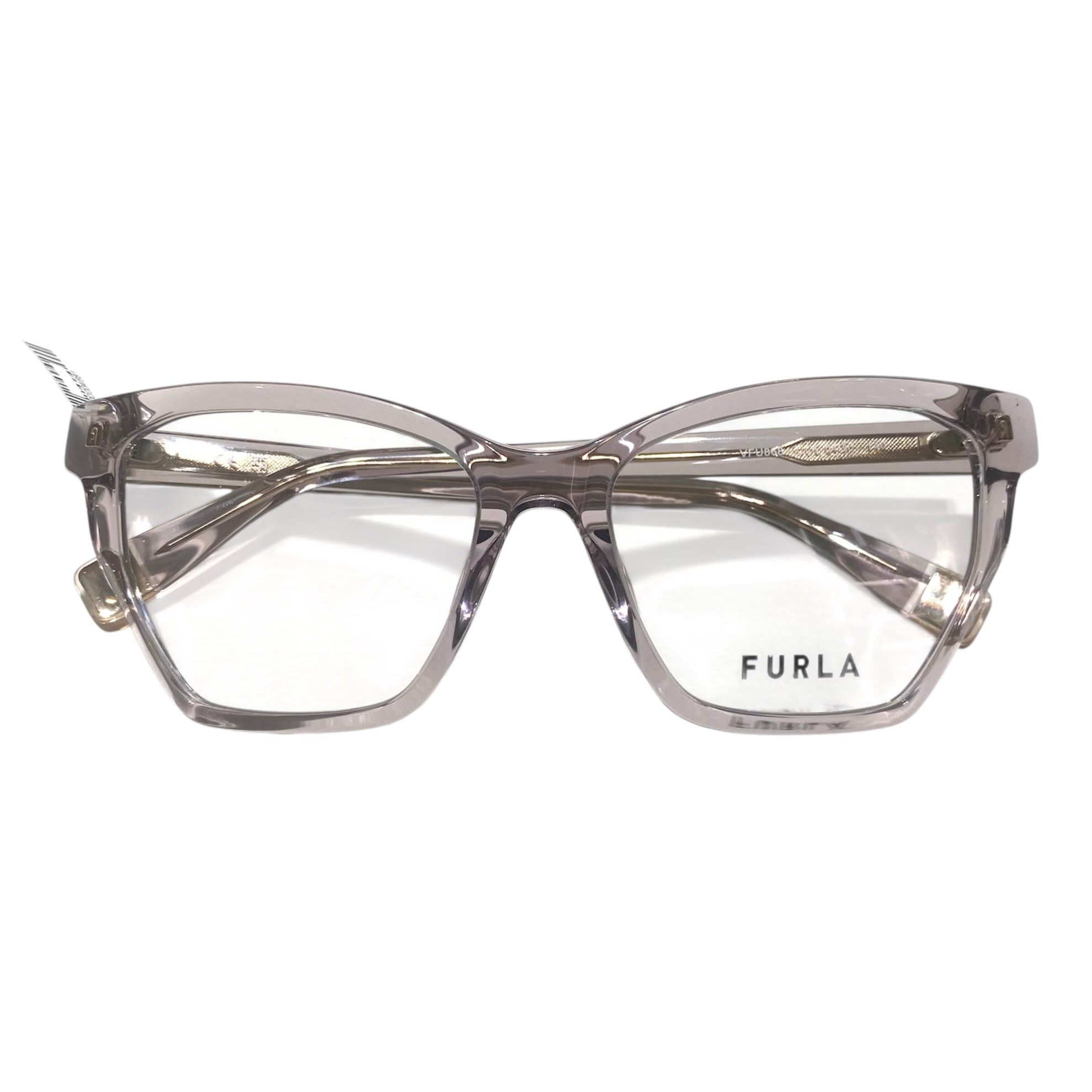 Occhiale da vista FURLA in acetato di celluloide trasparente con finali dell'asta dorati.