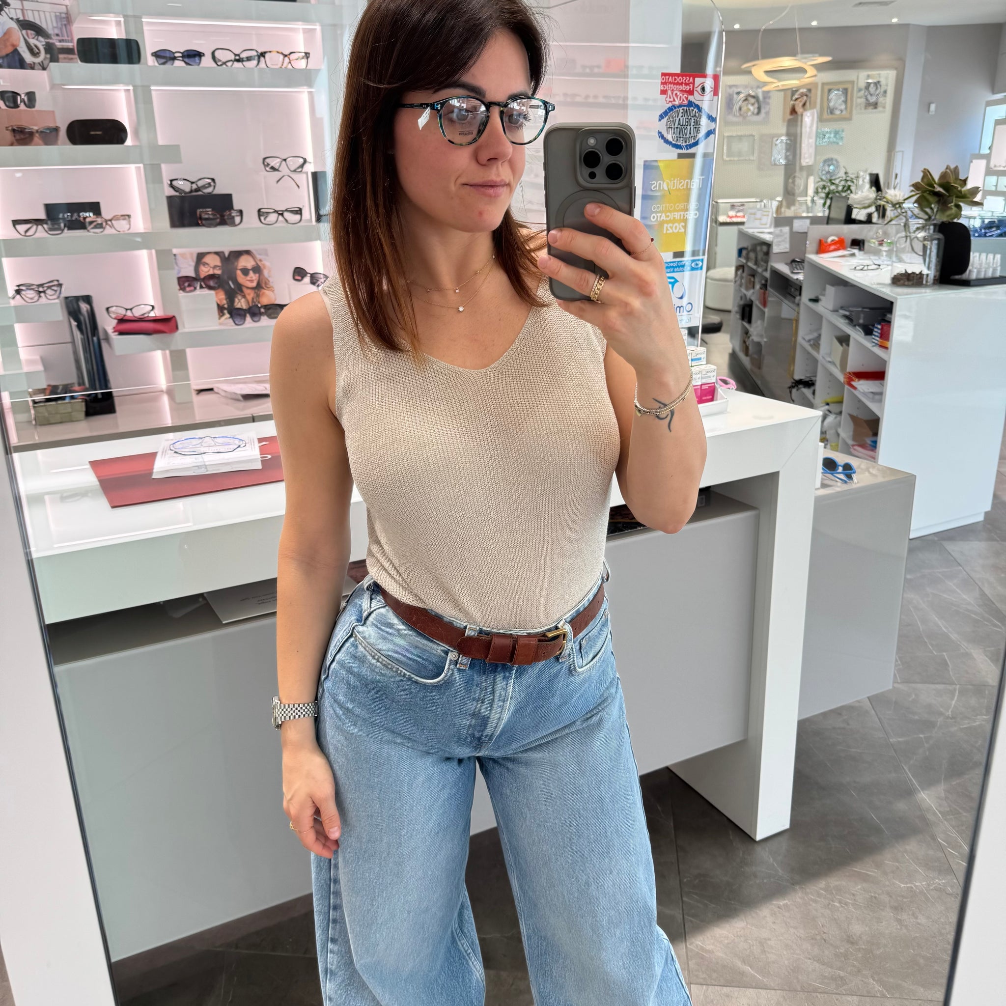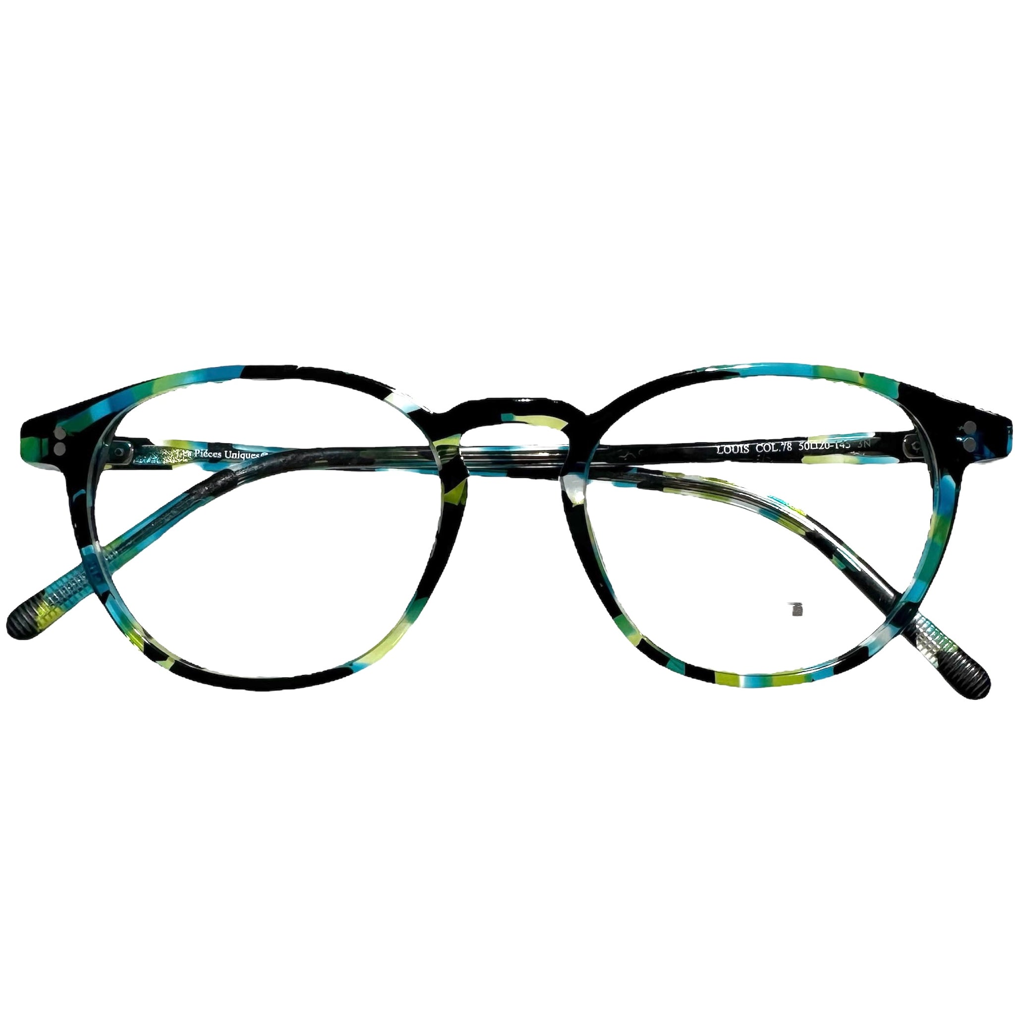 Occhiale da vista in acetato di celluloide verde, nero e blu maculato.
