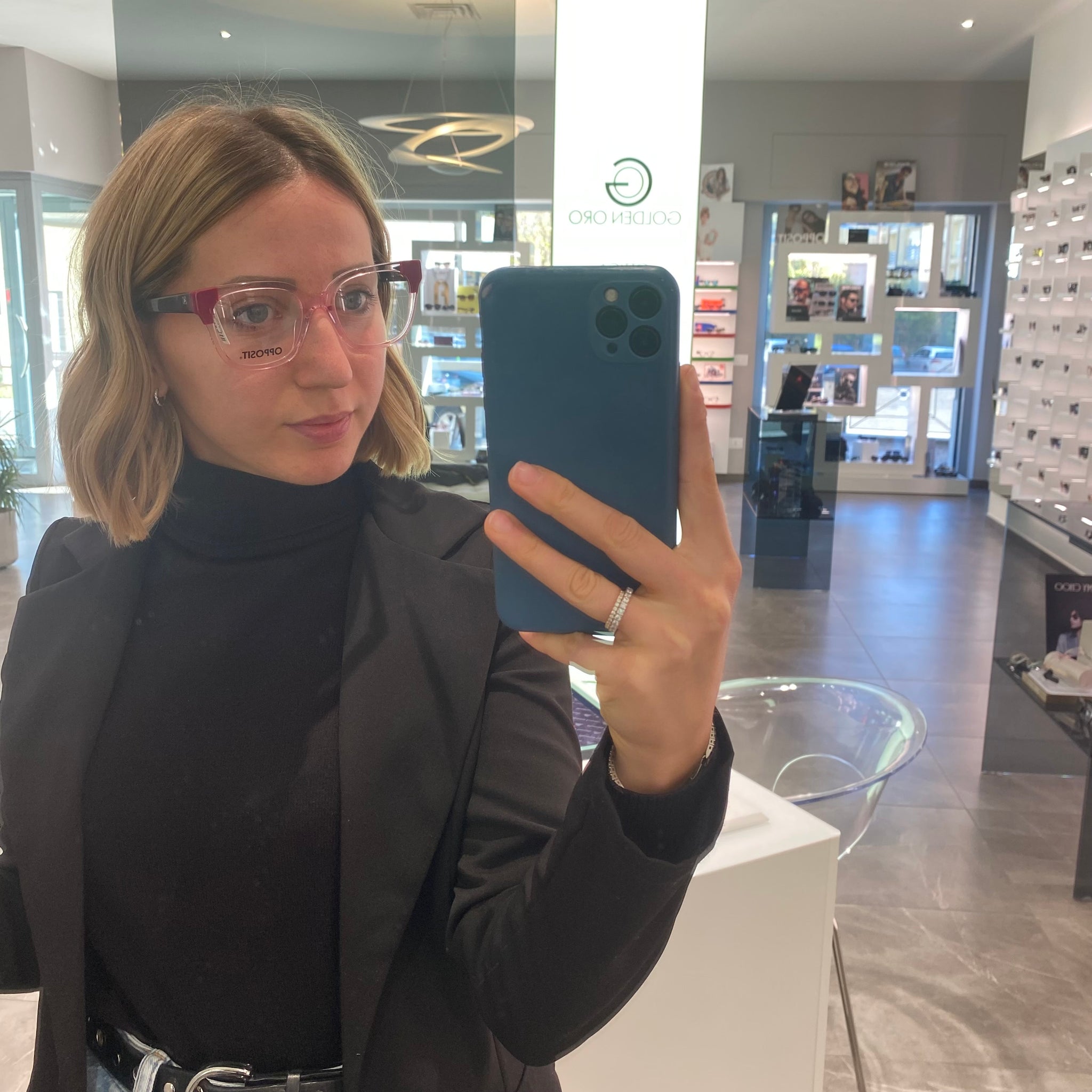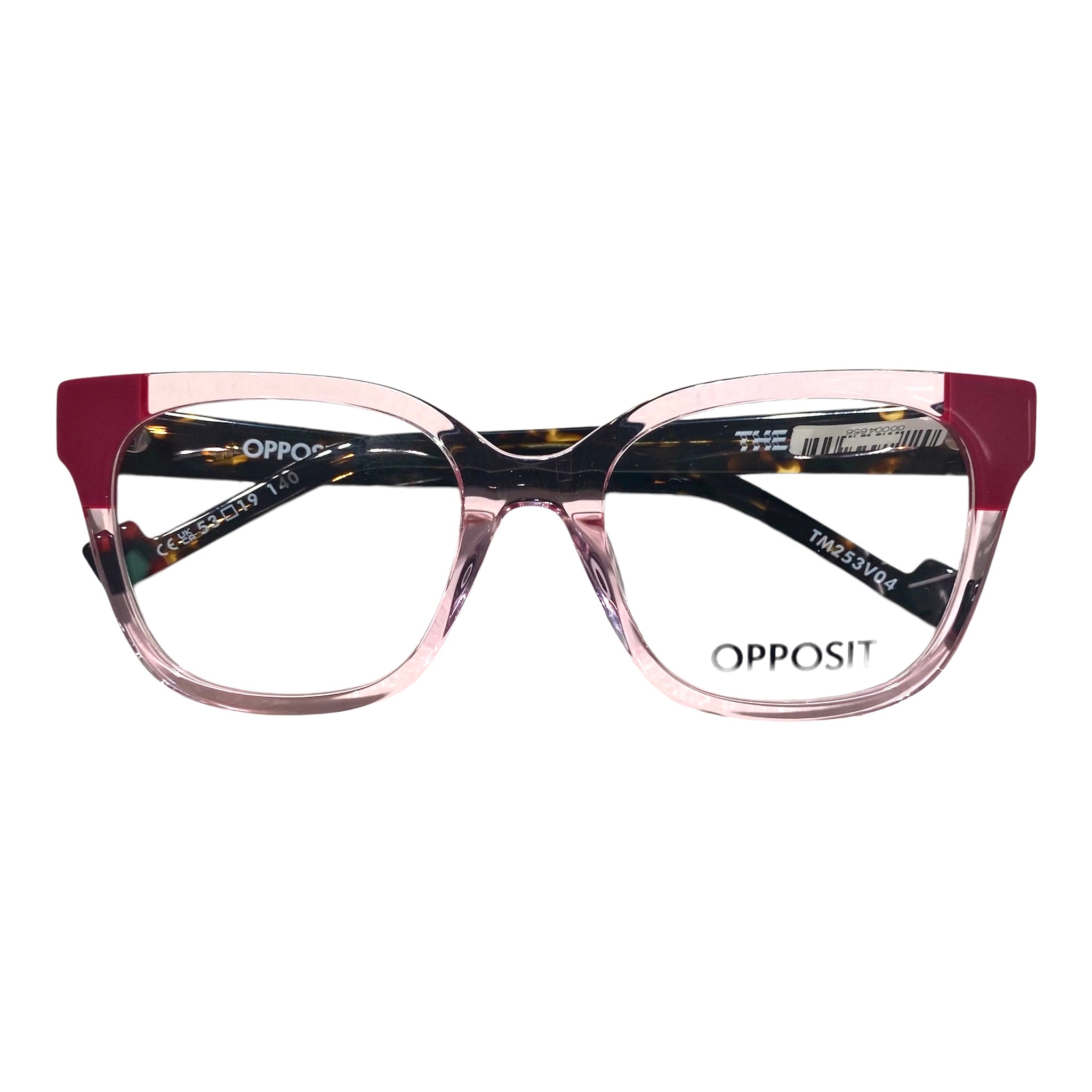 Occhiale da vista OPPOSIT in acetato di celluloide rosa trasparente con dettagli fuscia e aste maculate marroni.