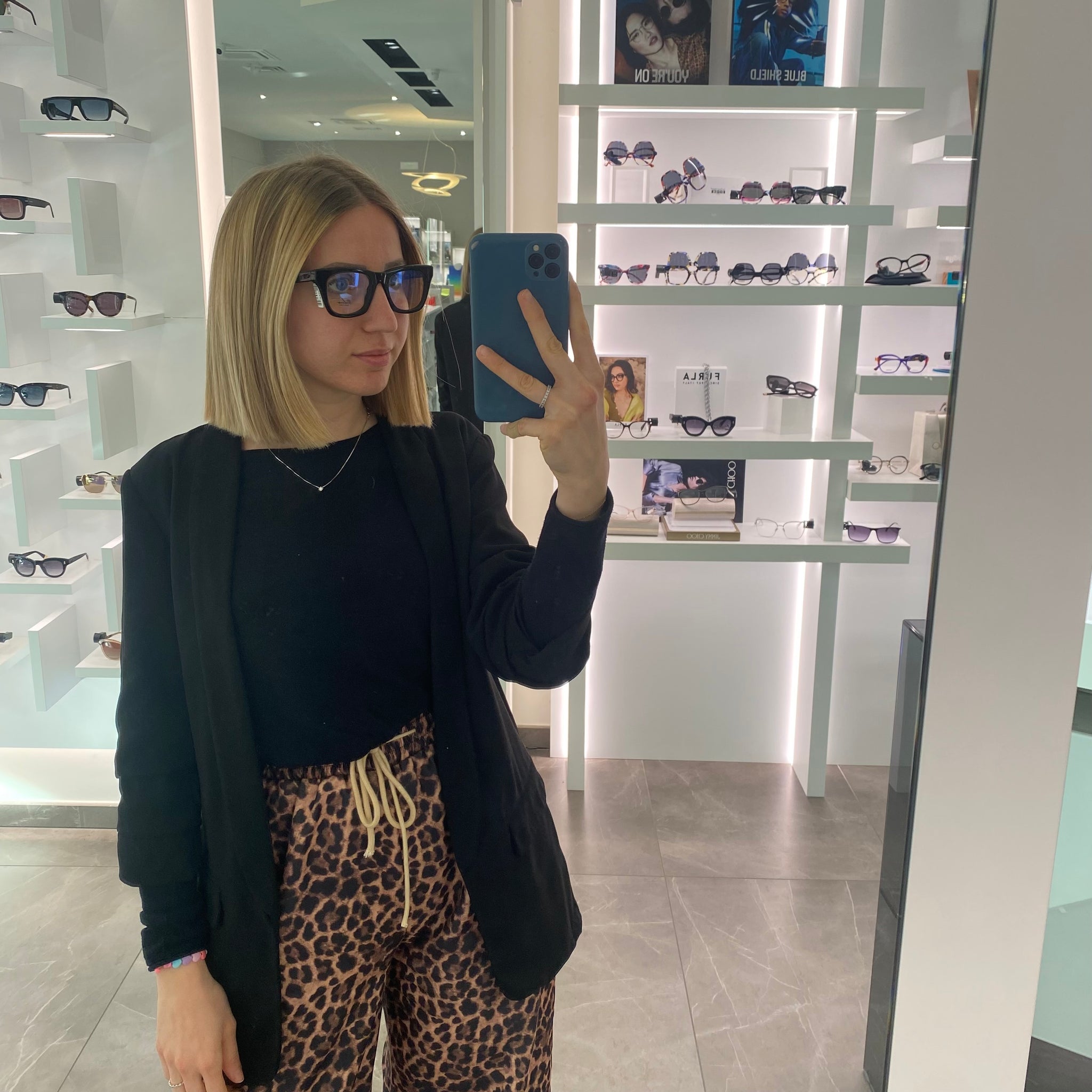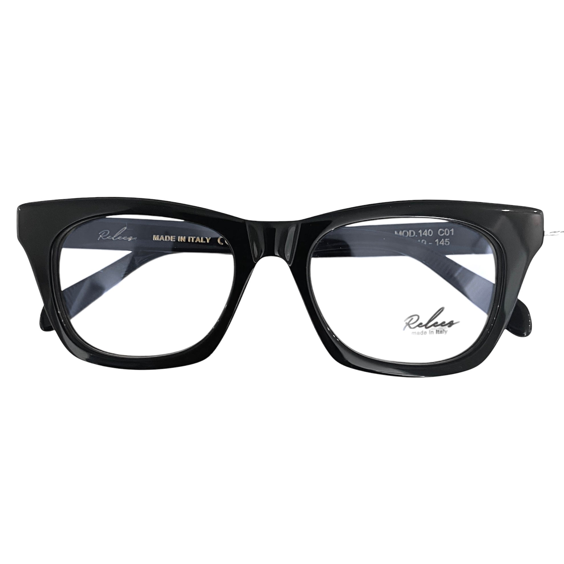 Occhiale da vista in celluloide quadrato con montatura nero lucida e ciliare dritto.