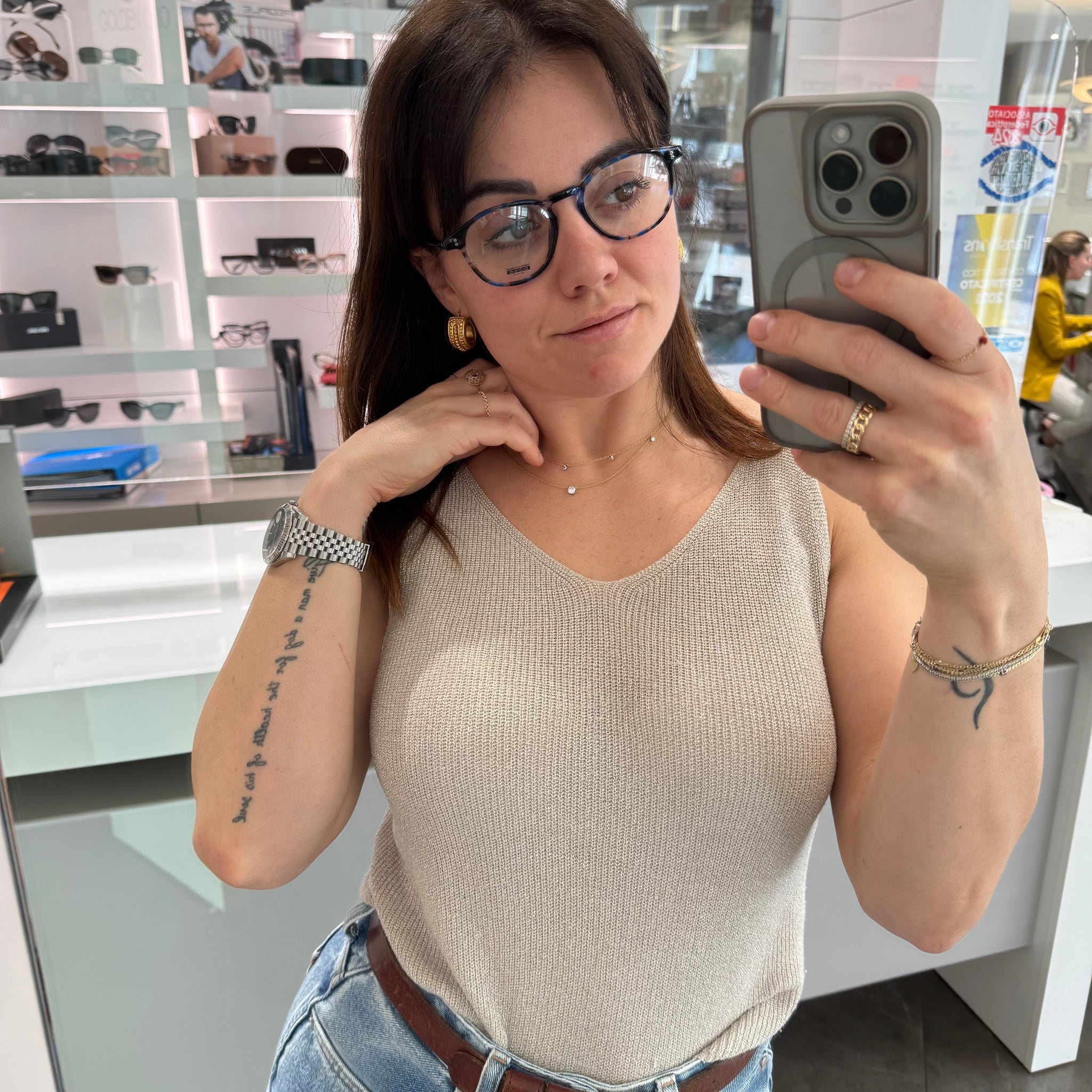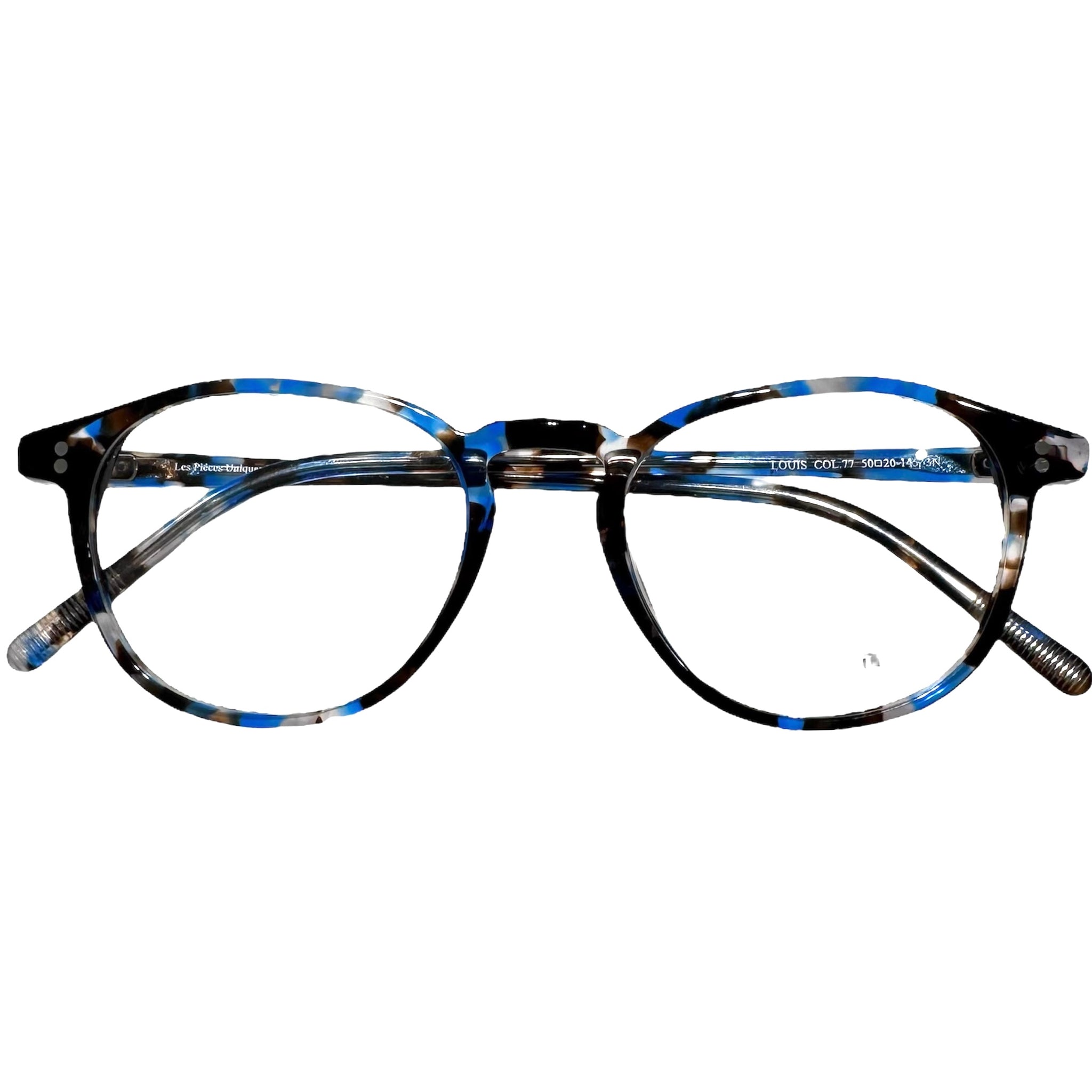 Occhiale da vista in acetato di celluloide nero e blu maculato.