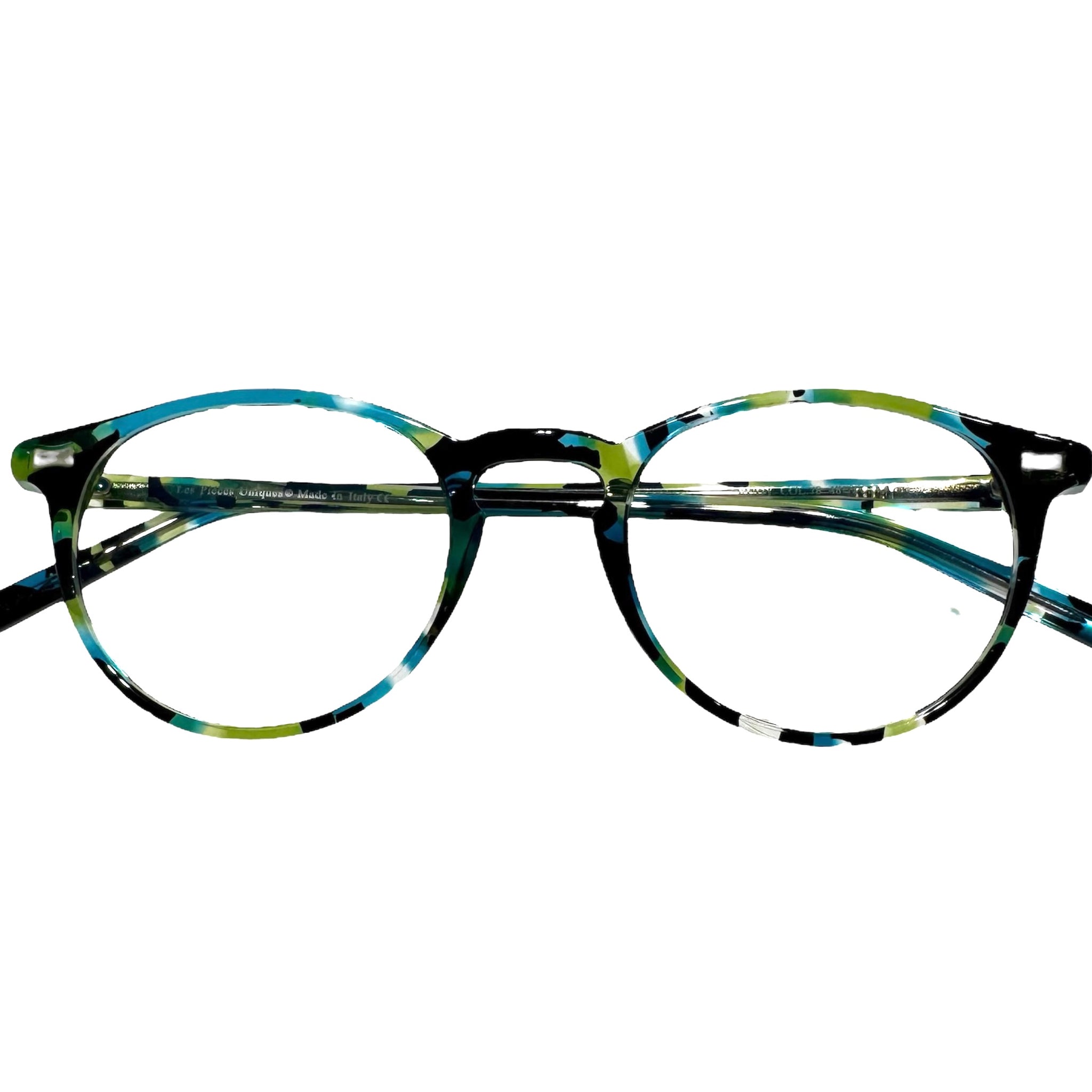 Occhiale da vista in acetato di celluloide verde, nero e azzurro maculato.