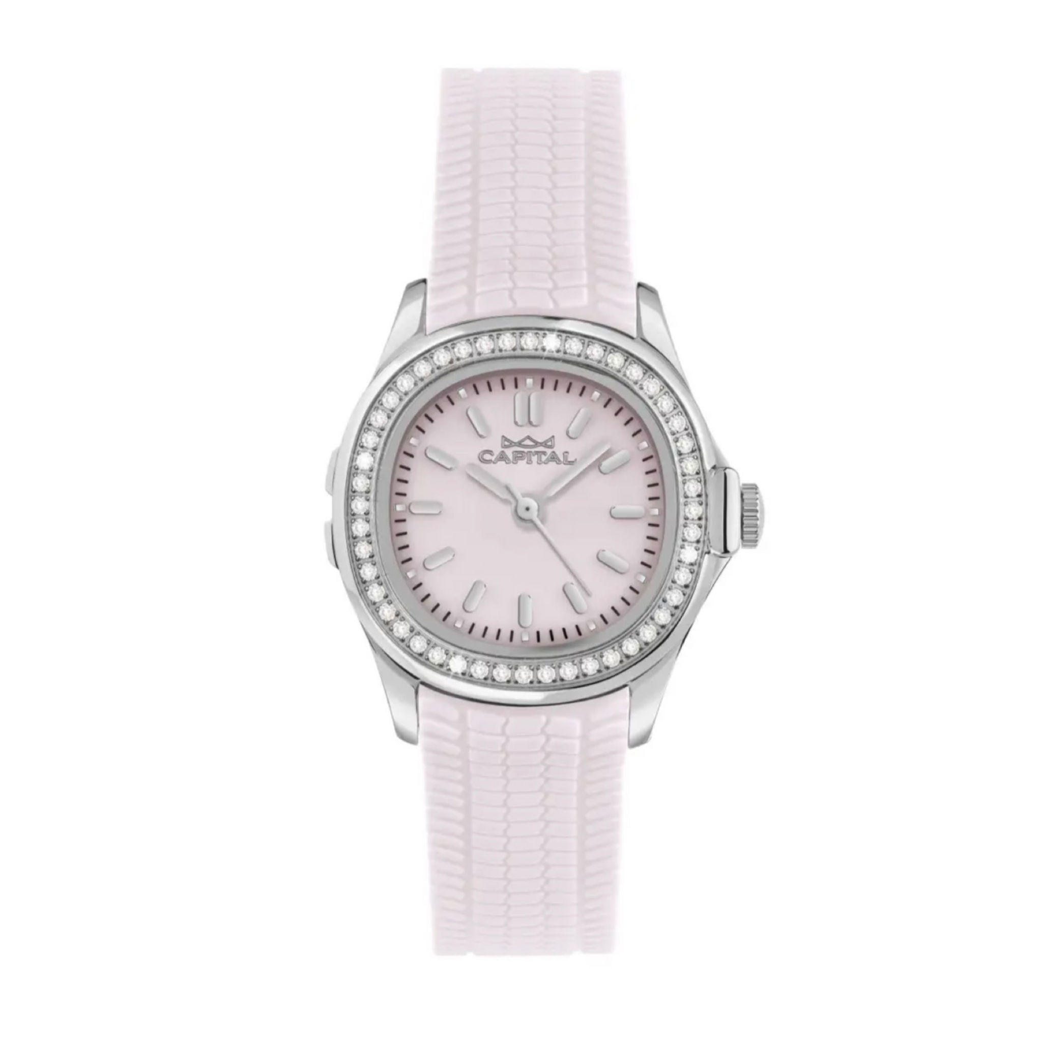 Orologio Capital Donna con movimento al quarzo Miyota, cassa in acciaio da 28 mm, ghiera con pietre e cinturino in silicone rosa. Eleganza e praticità, impermeabile 5 ATM.