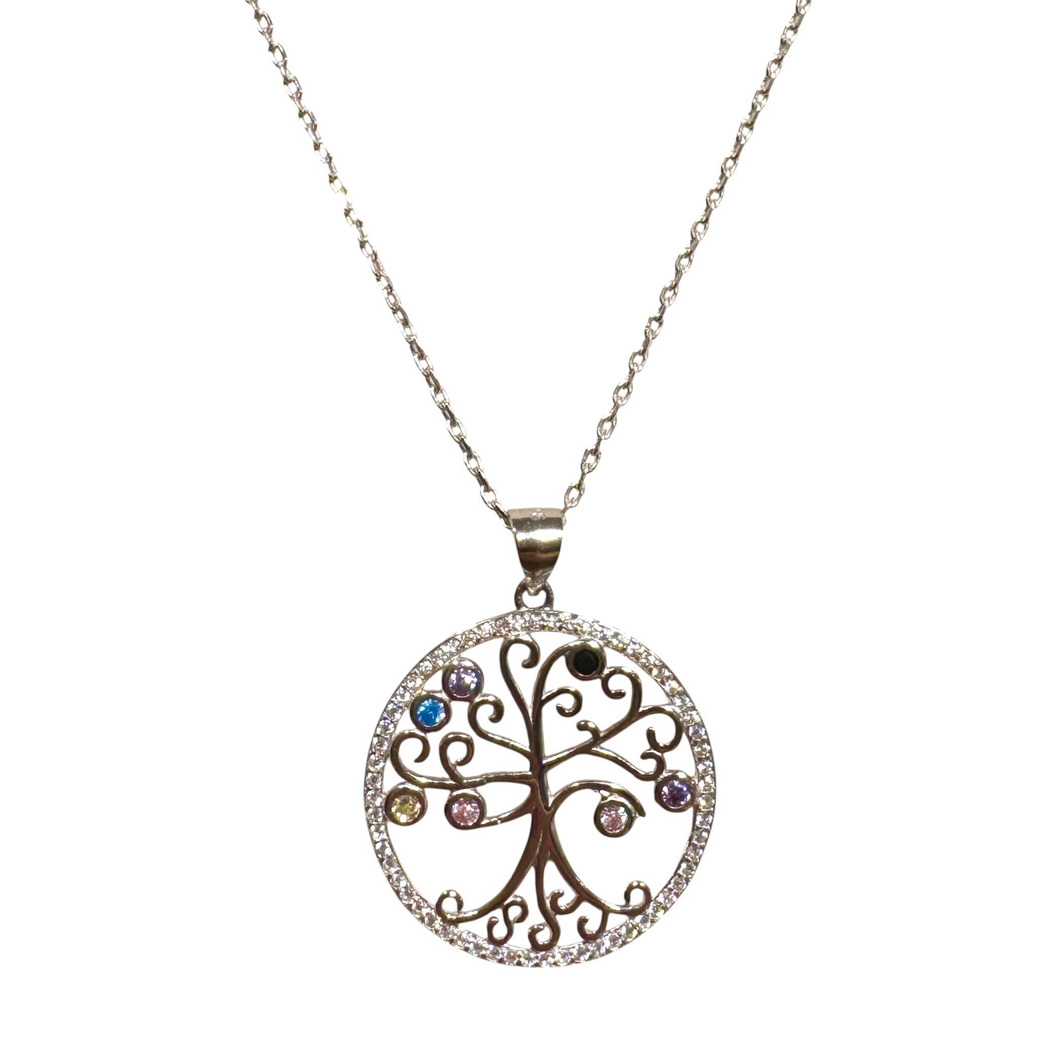 Collana in argento 925% con ciondolo a forma di cerchio con albero della vita centrale da zirconi trasparenti e colorati su di esso.