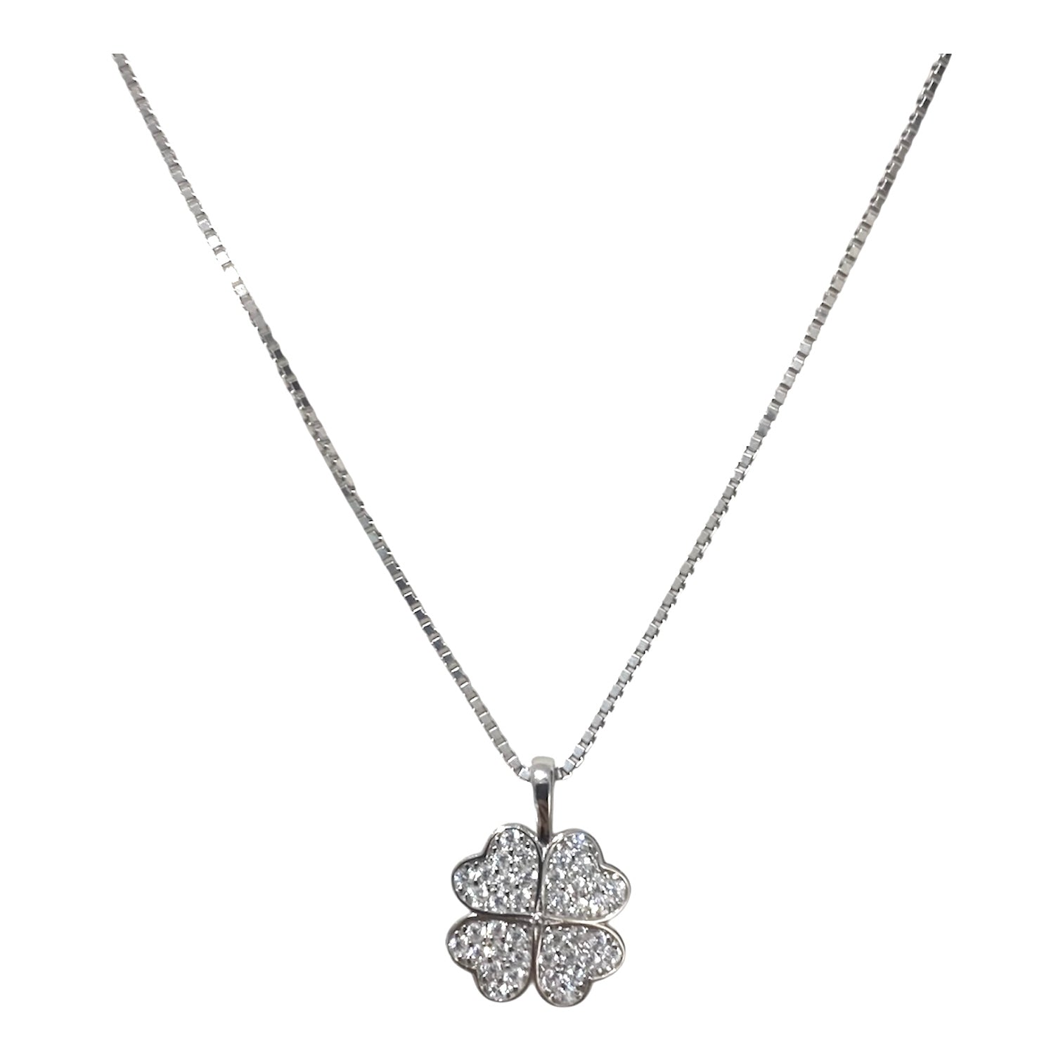 Collana in argento 925% con ciondolo a forma di quadrifoglio tempestato da zirconi trasparenti.