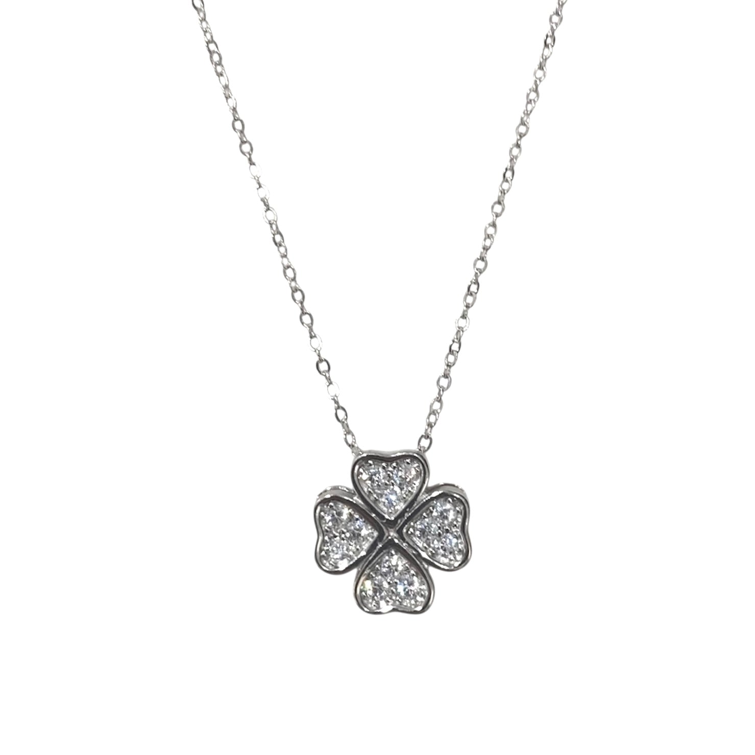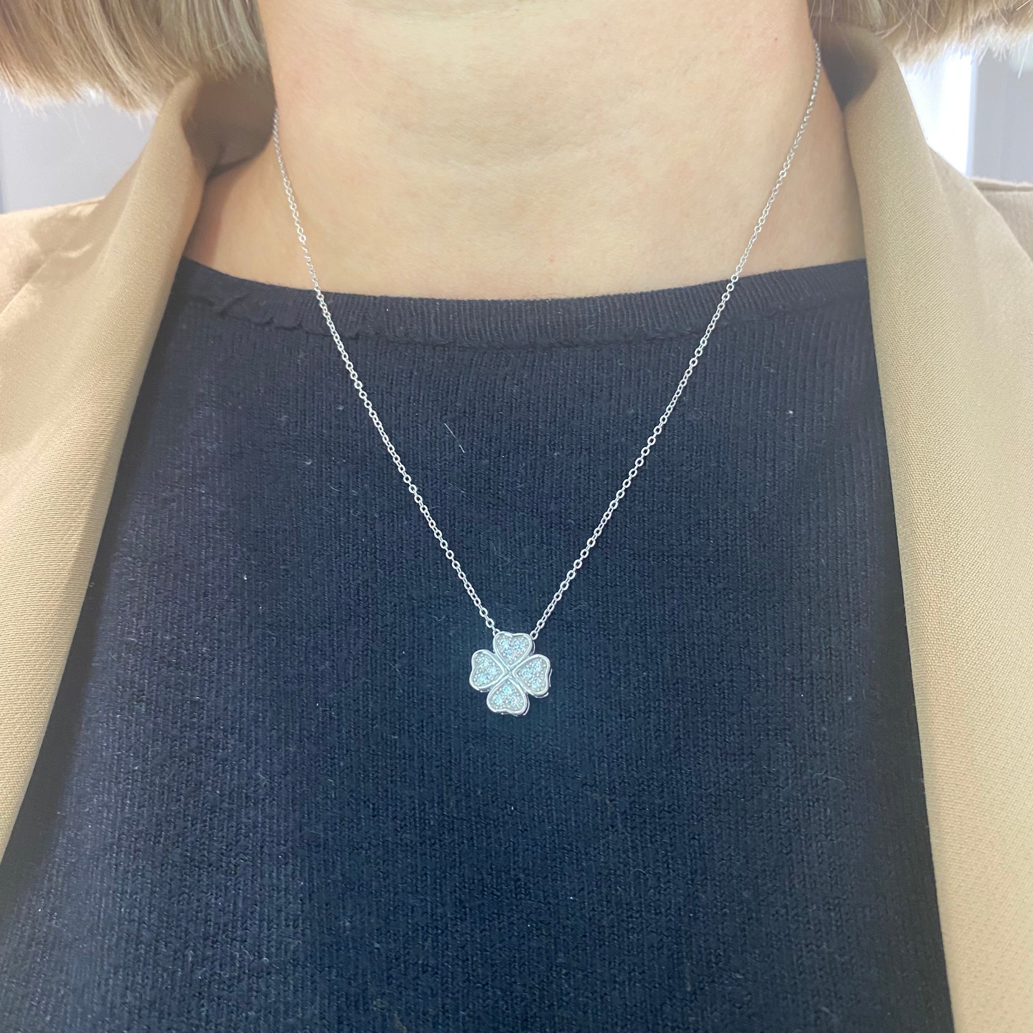 Collana in argento 925% con ciondolo a forma di quadrifoglio fisso tempestato da zirconi trasparenti.
