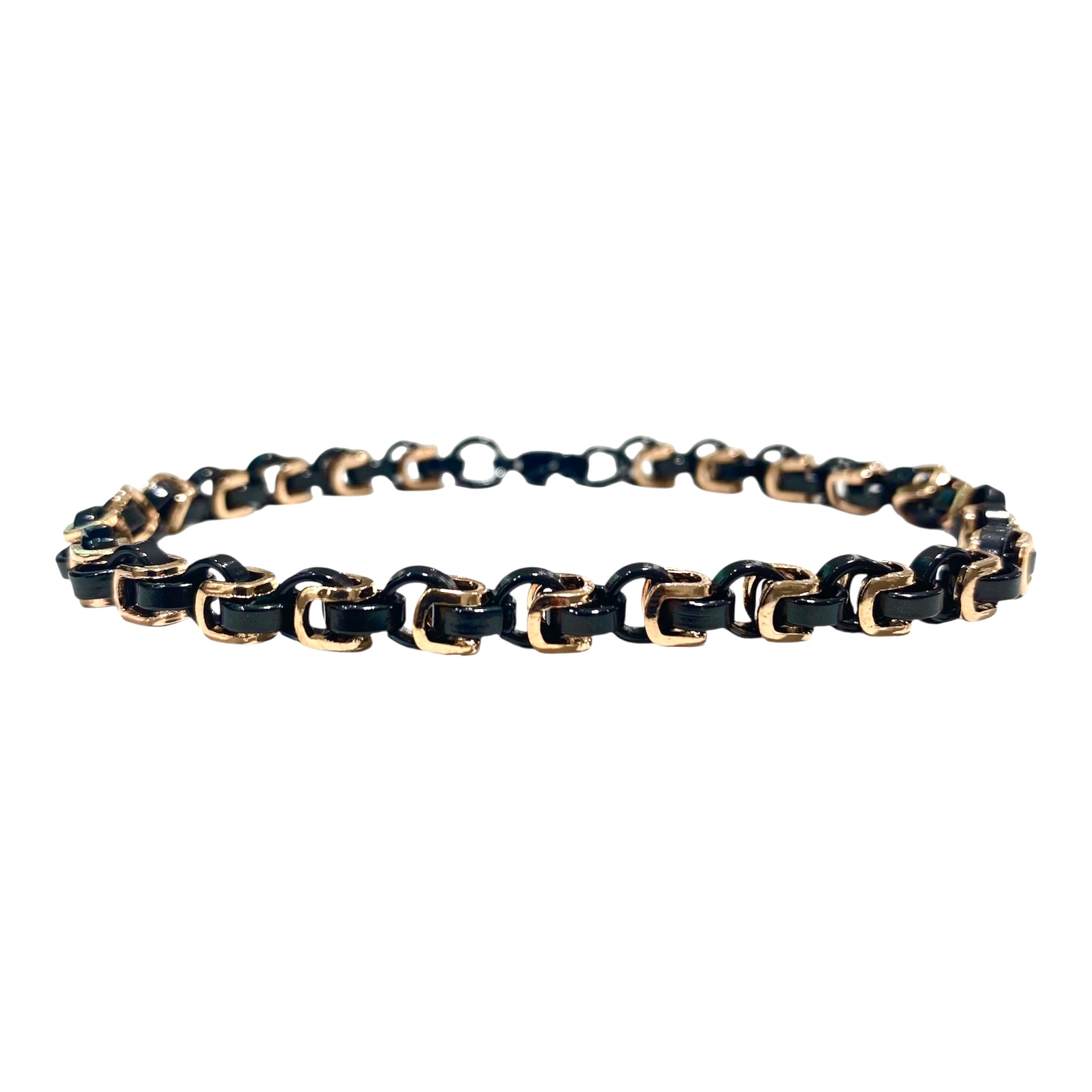 Bracciale da uomo in acciaio nero e rosato con maglia intrecciata e chiusura a moschettone.