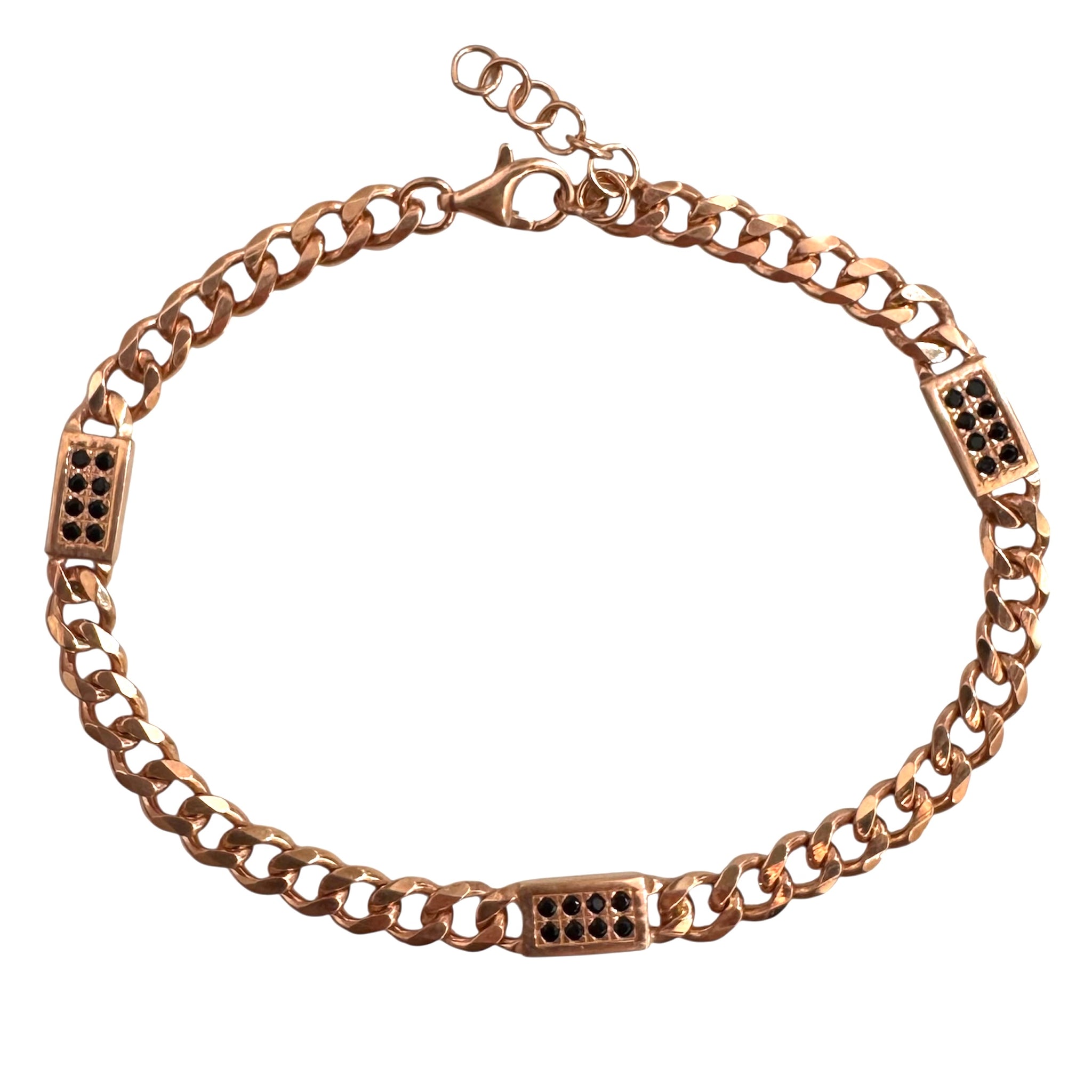 Bracciale in argento 925% con maglia a catena placcato oro rosa e tre piastrine con otto pietre nere incastonate.