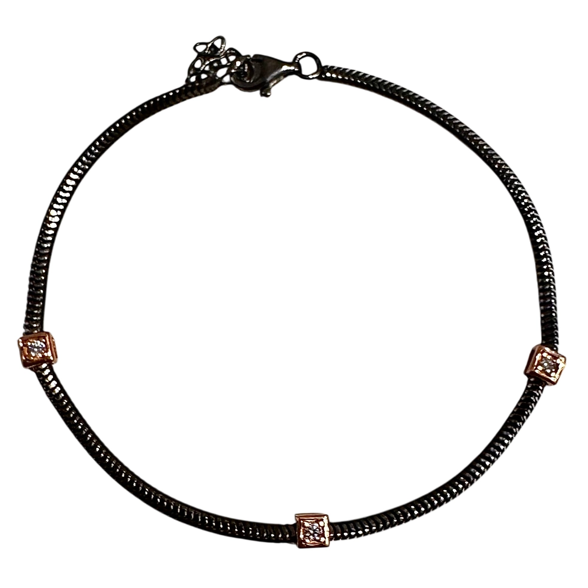Bracciale in argento 925% maglia a coda di topo brunita di nero con tre dadini sulla lunghezza placcati oro rosa sui quali sono incastonati uno zircone centrale  con chiusura a moschettone .