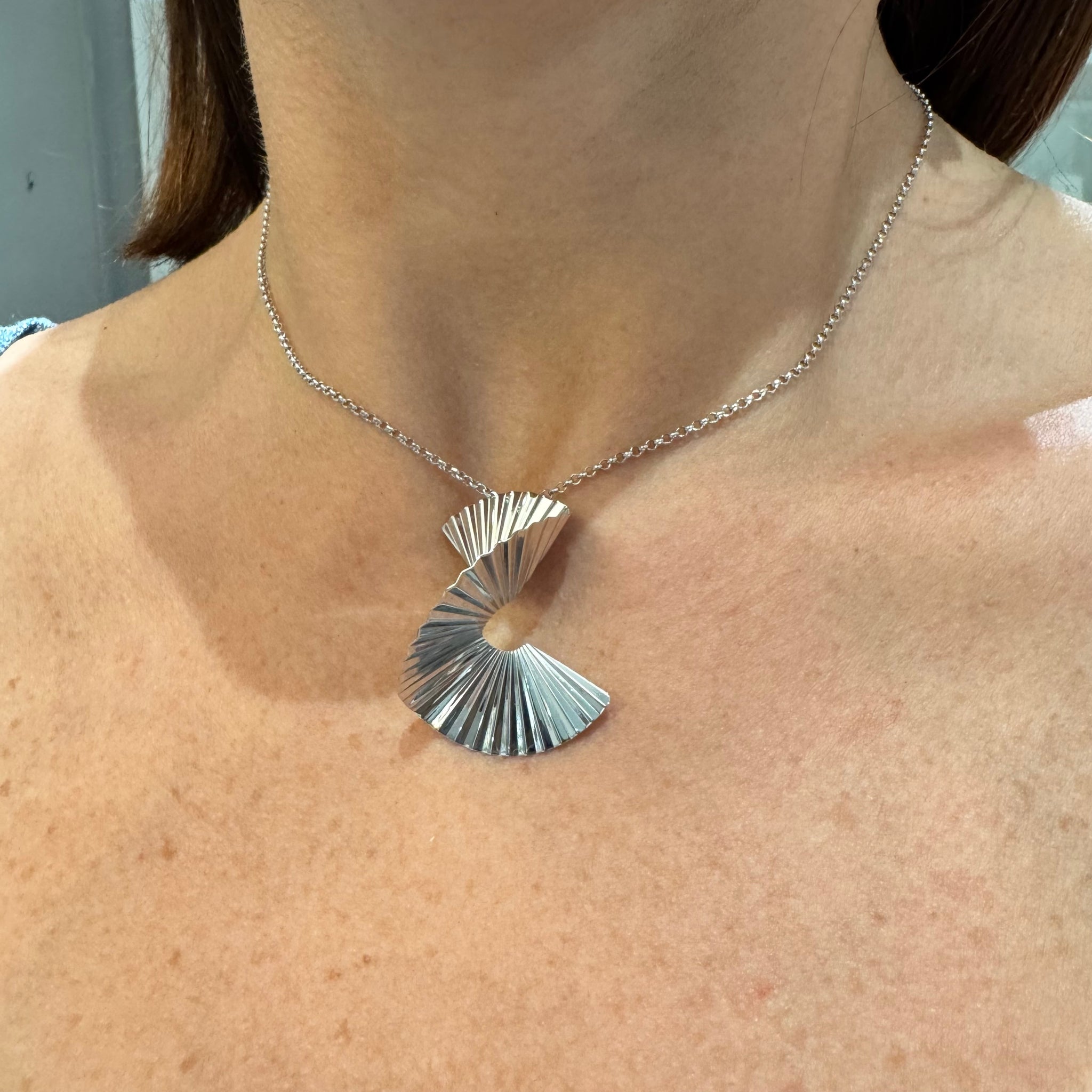 Collana in argento 925% con ciondolo a spirale, le cui pieghe ricordano quelle del ventaglio.