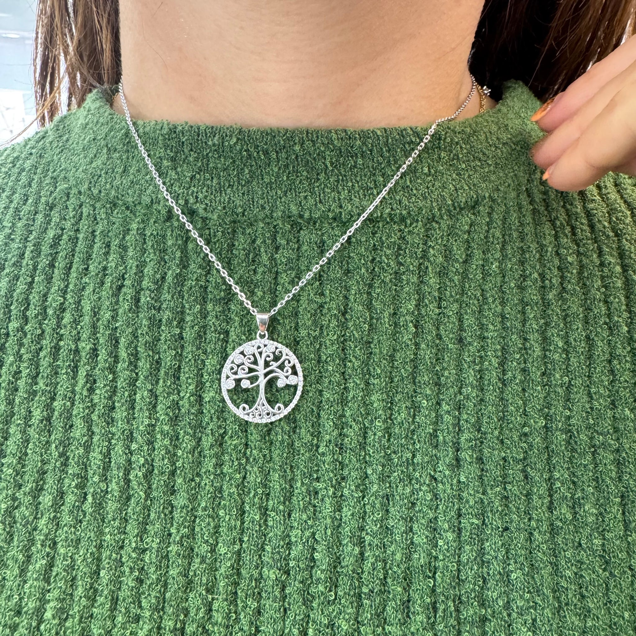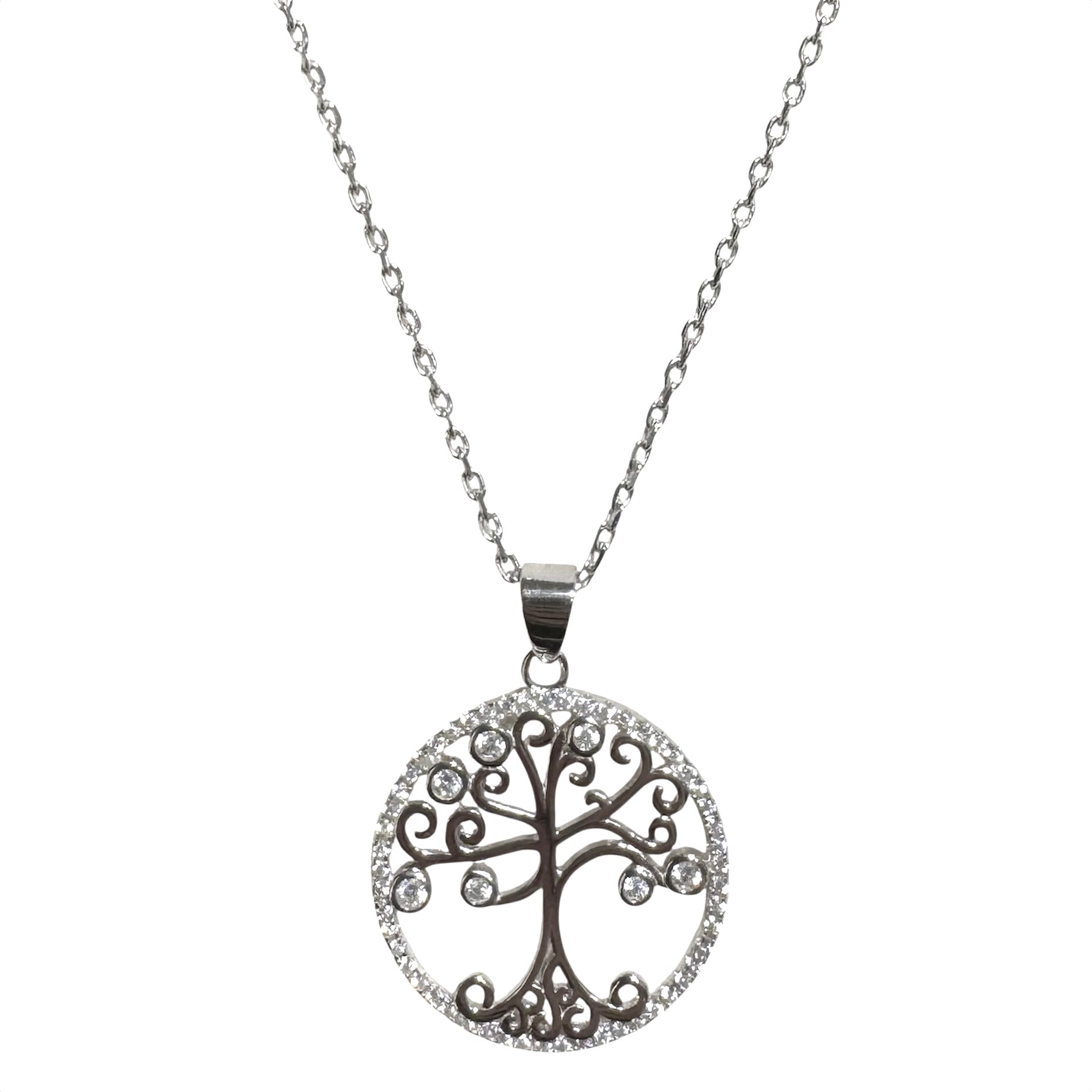 Collana in argento 925% con ciondolo a forma di cerchio con albero della vita centrale da zirconi trasparenti su di esso.