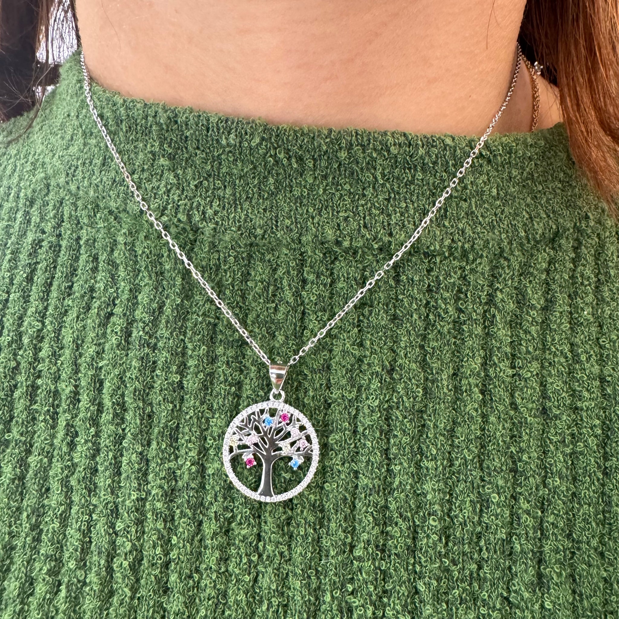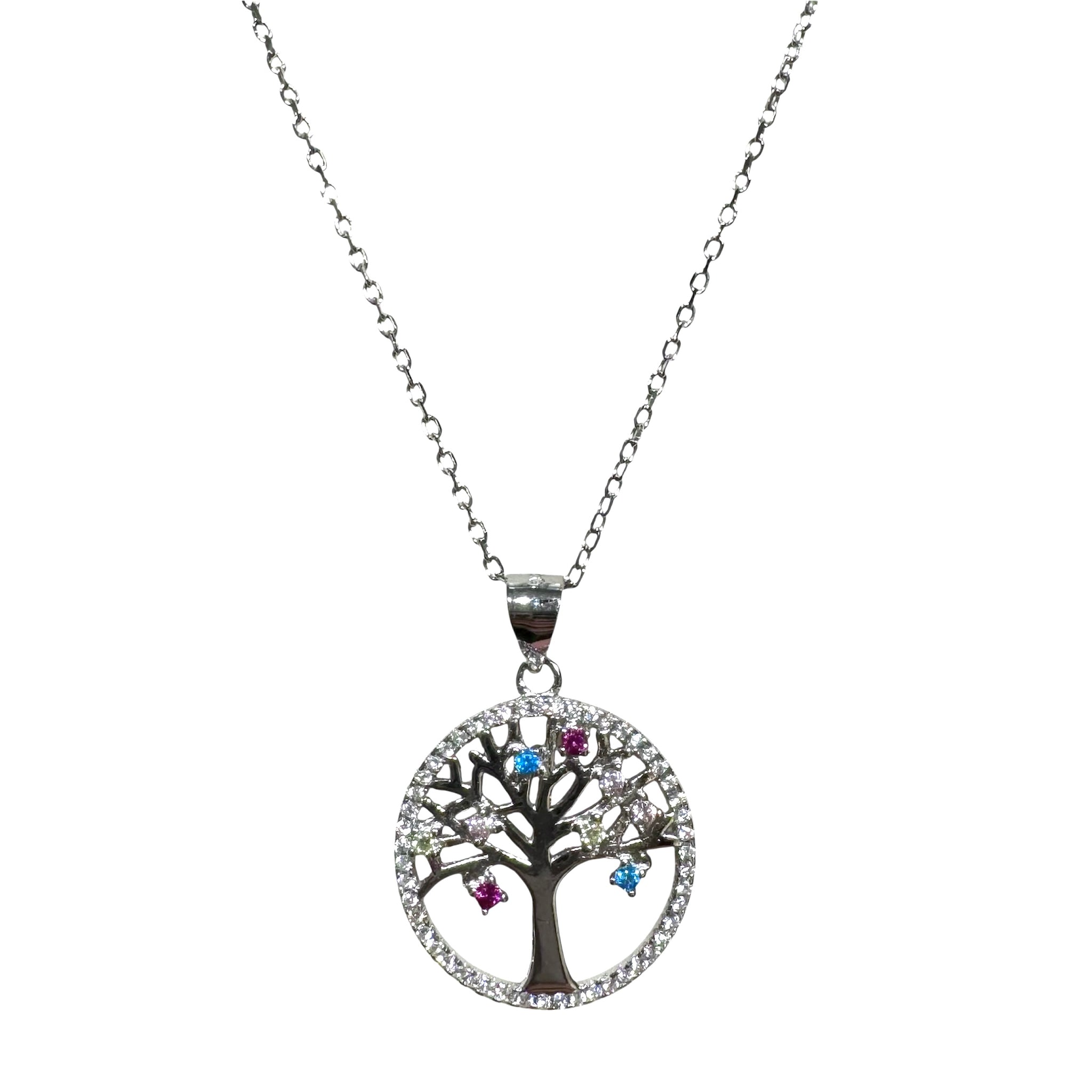 Collana in argento 925% con ciondolo a forma di cerchio con albero della vita centrale da zirconi trasparenti e colorati su di esso.