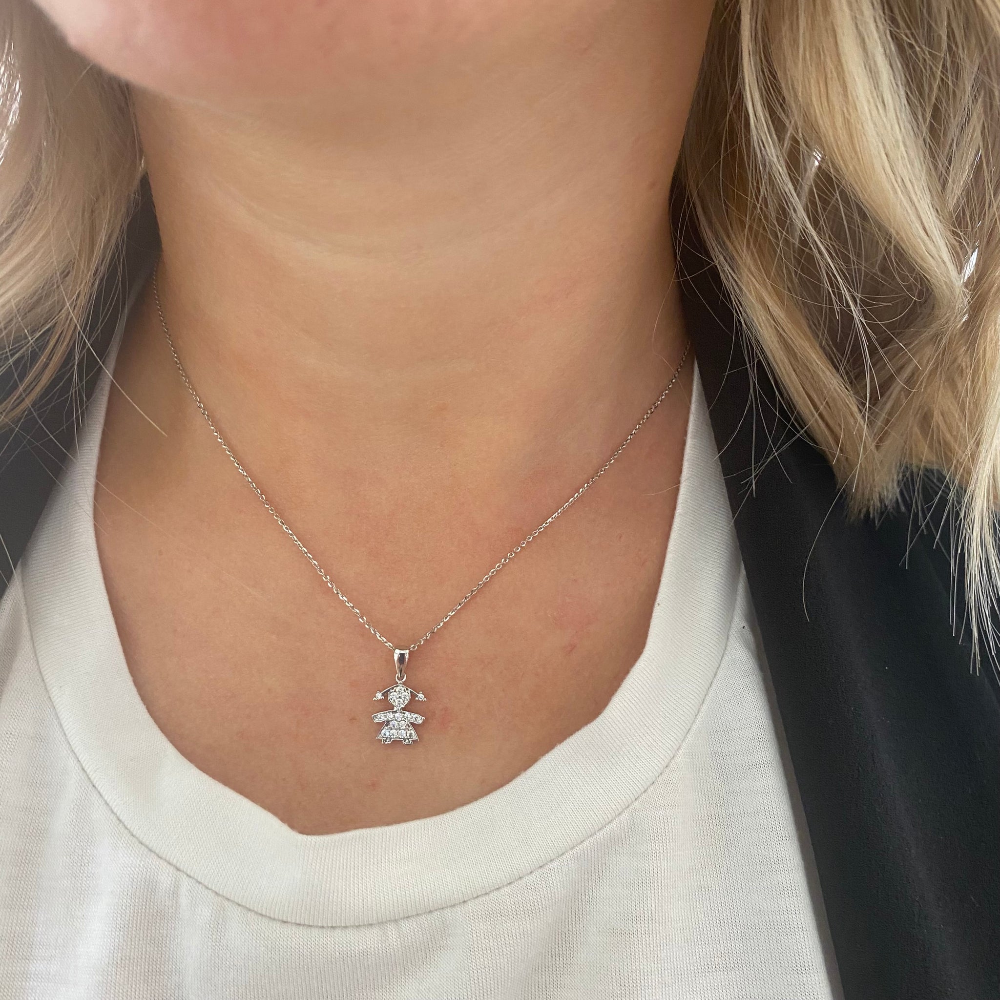 Catenina in oro bianco 18KT/750% con zirconi incastonati nel ciondolo a forma di bambino stilizzato.