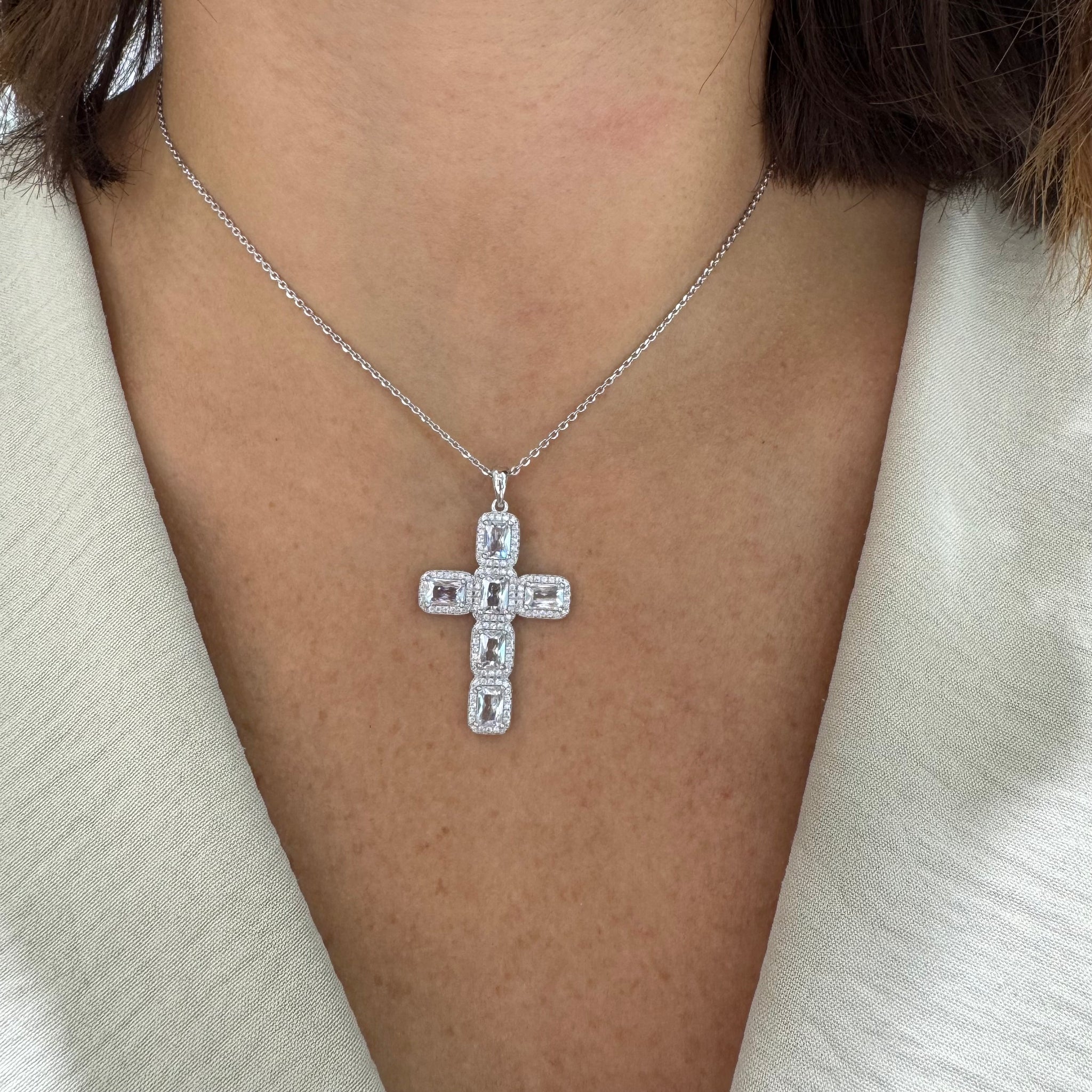 Collana in argento 925% con ciondolo a forma di croce con zirconi di vari tagli incastonati.