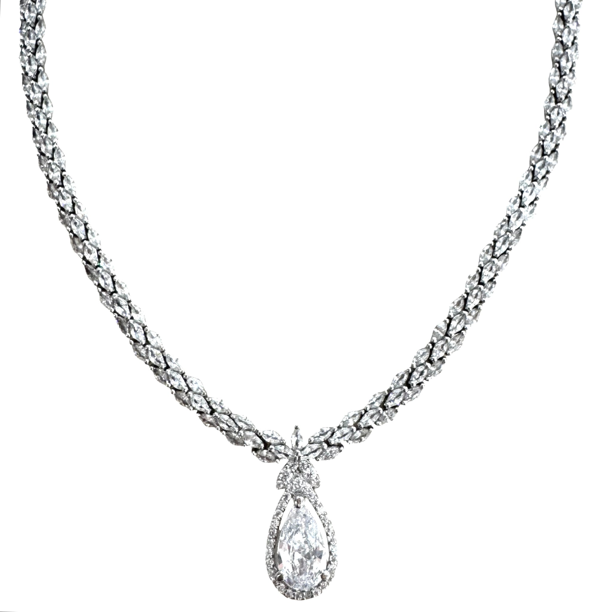 Collana in argento 925% con zirconi taglio marquise incastonati su tuta la lunghezza e diadema pendente centrale con grande zircone taglio goccia contornati da piccoli zirconi taglio brillante.