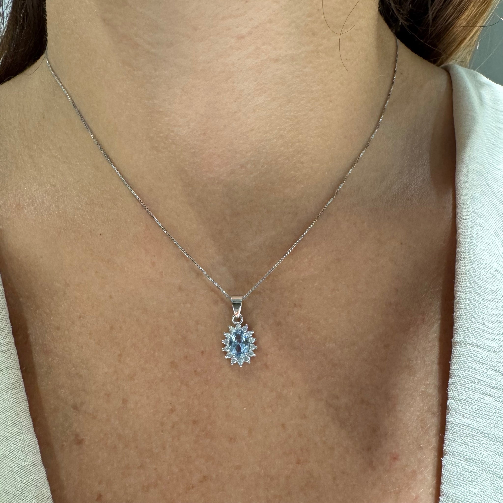Collana in argento 925% con ciondolo ovale con zircone azzurro incastonato e contornato da zirconi trasparenti