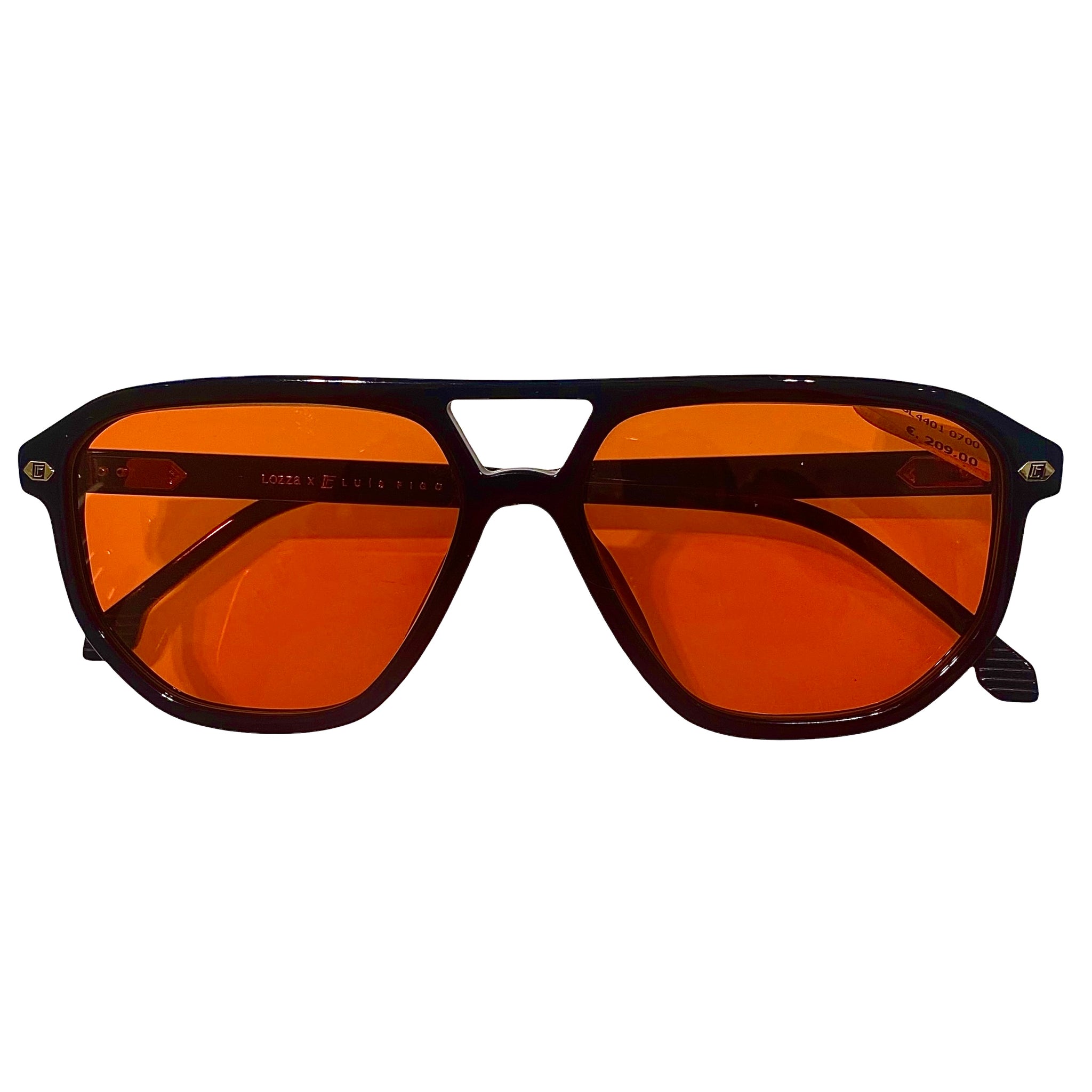Occhiale da sole in acetato di celluloide nero doppio ponte e dettaglio sull'asta con lente colore intero arancio.