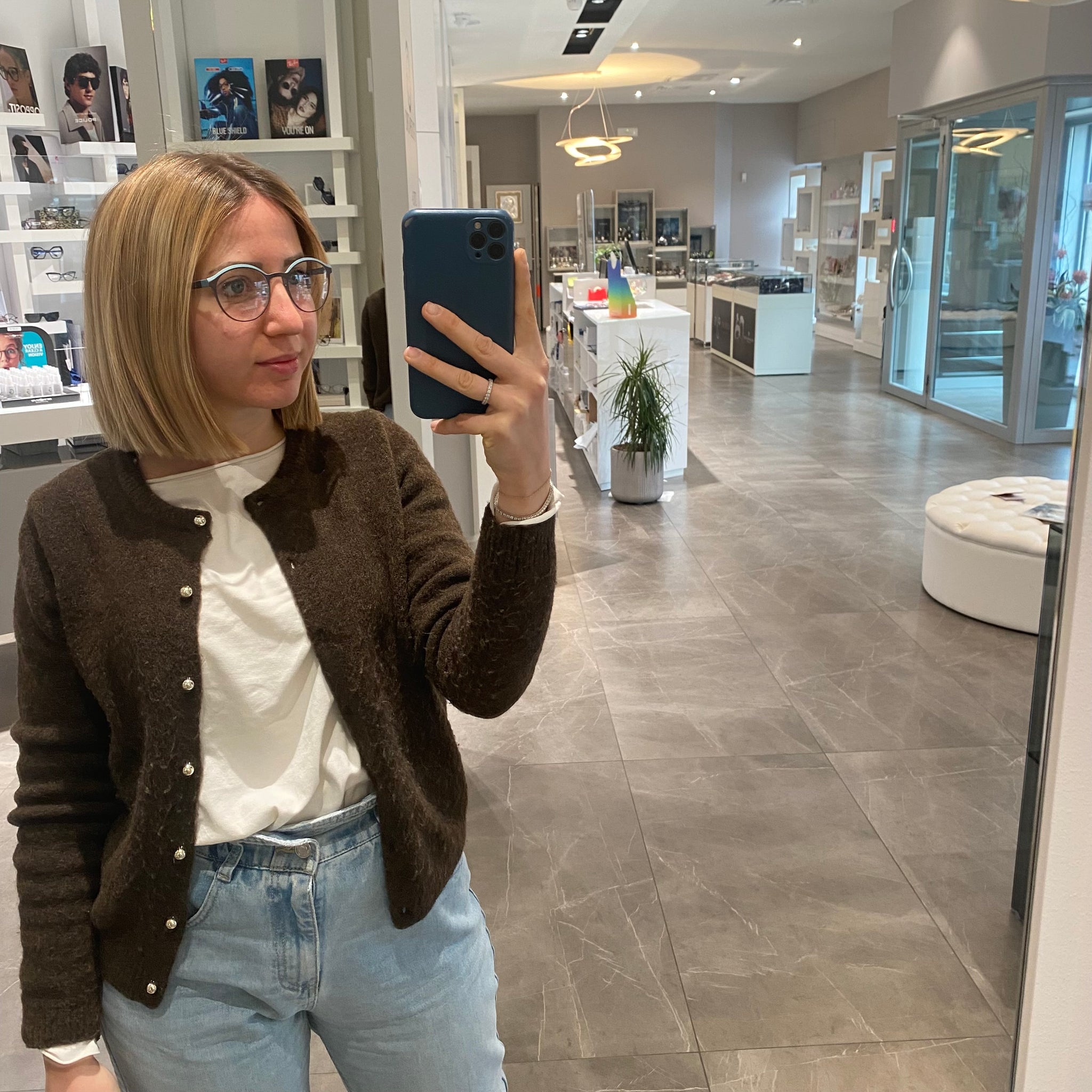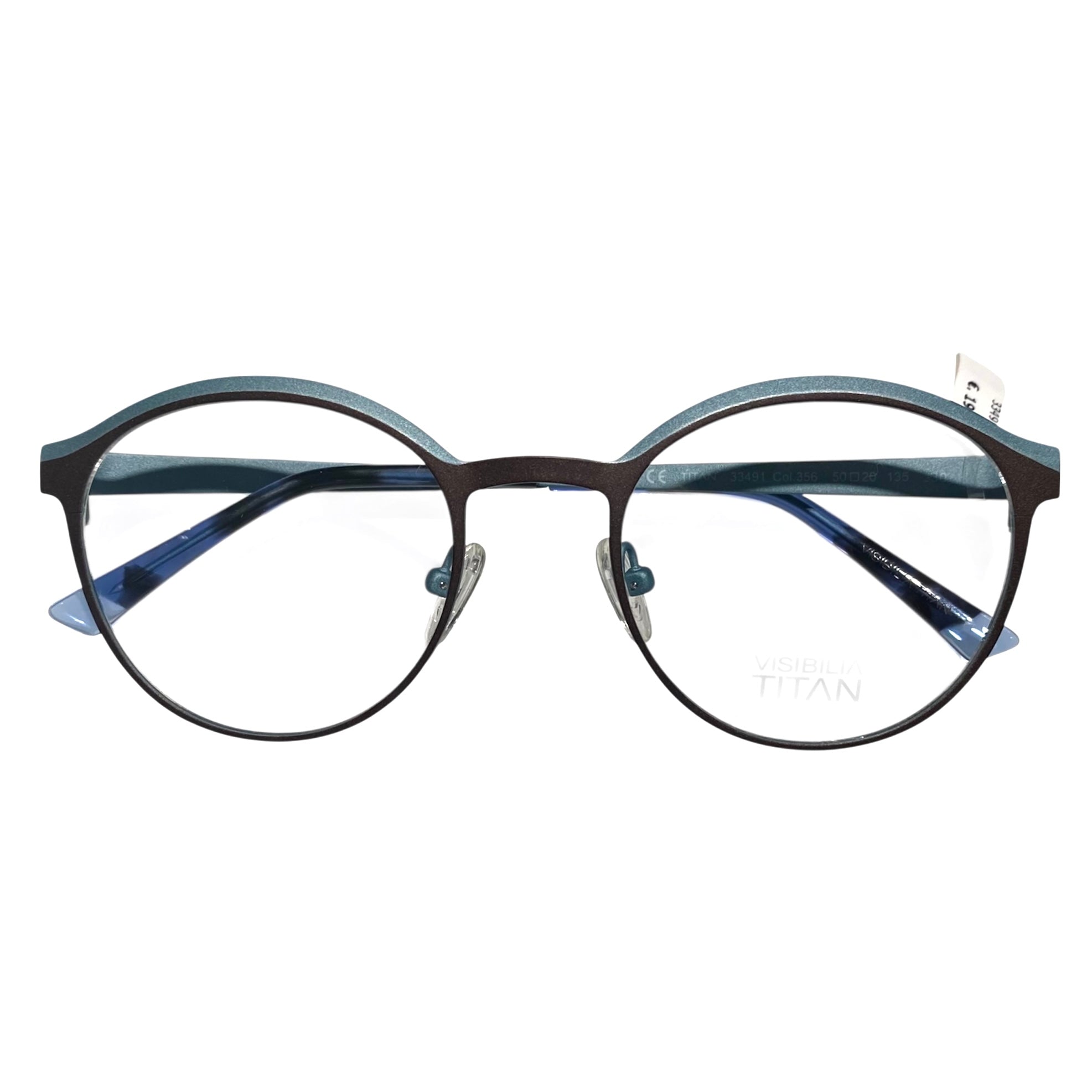 Occhiale da vista tondo in titanio color marrone con interno e ciliare azzurro.