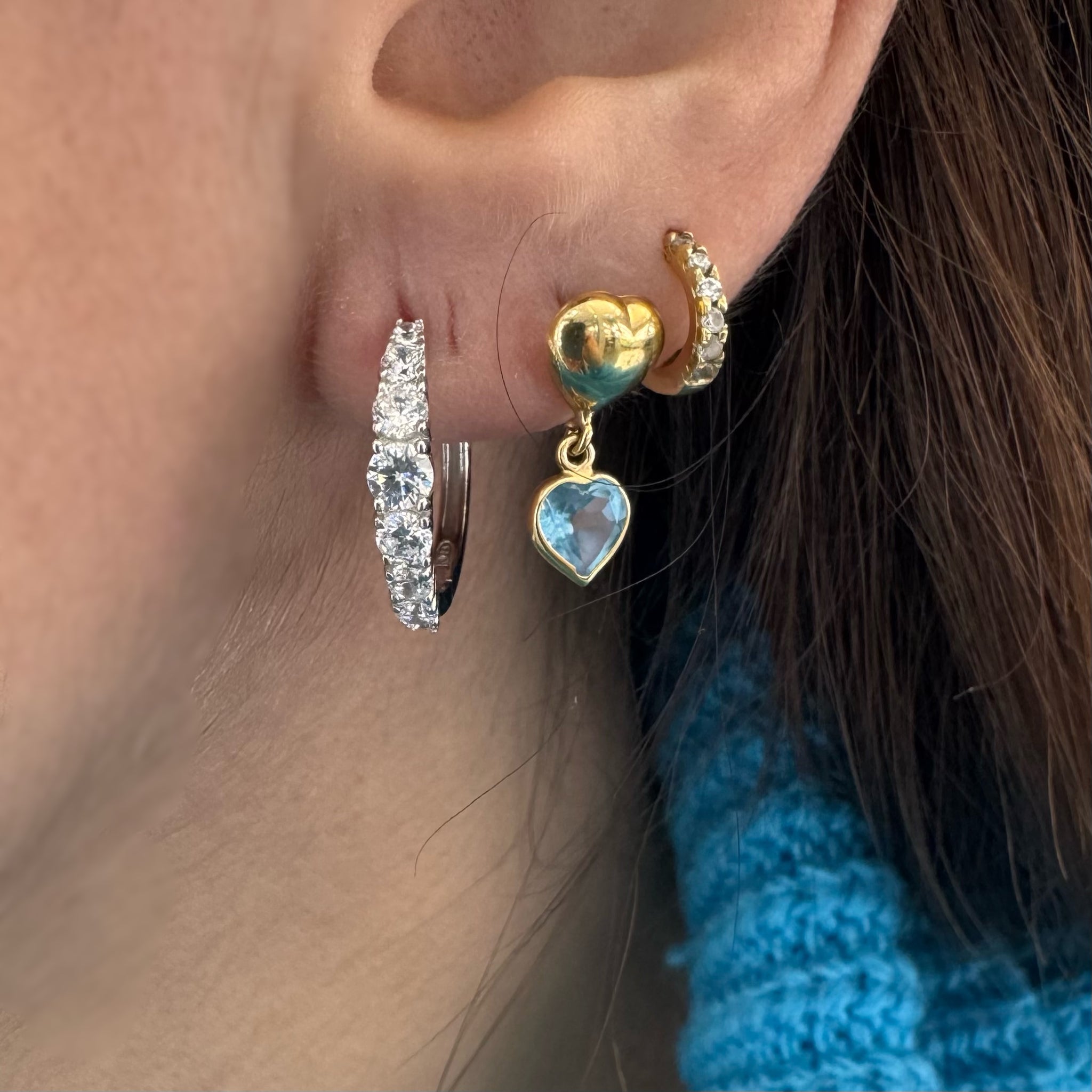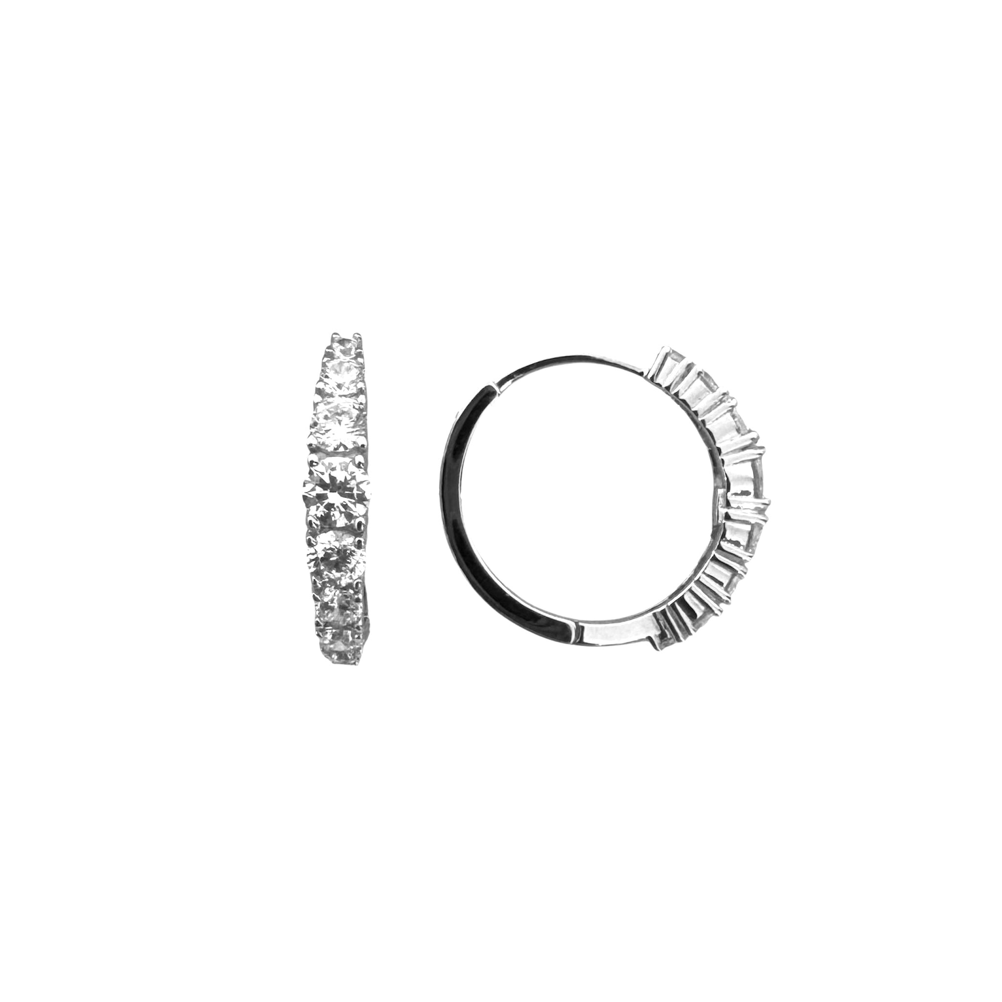Orecchini in argento 925% a cerchio con chiusura a scattino e zirconi di diverse dimensioni sulla parte frontale.